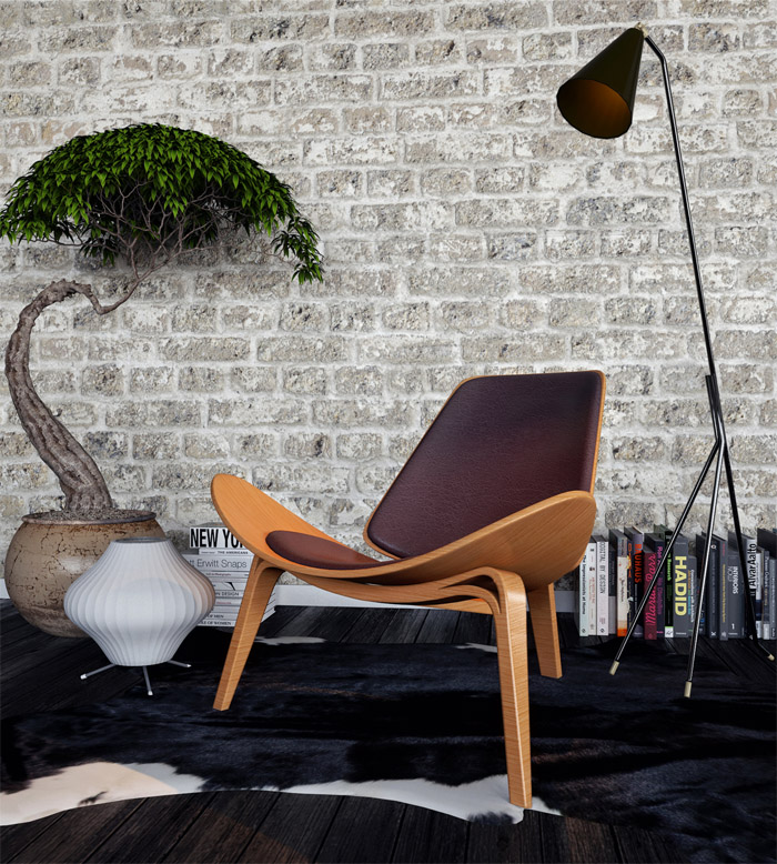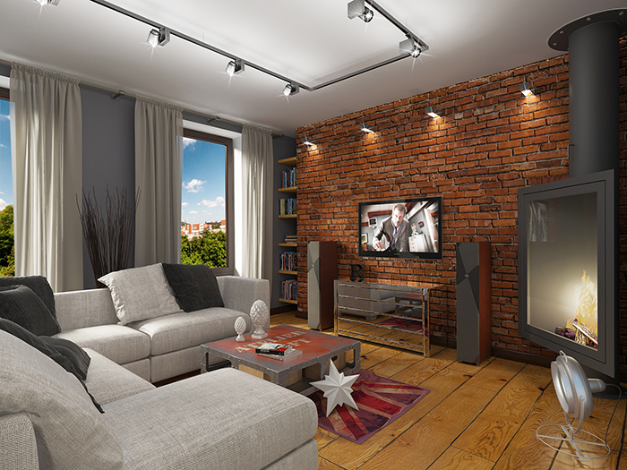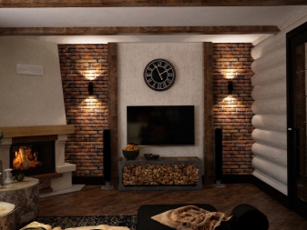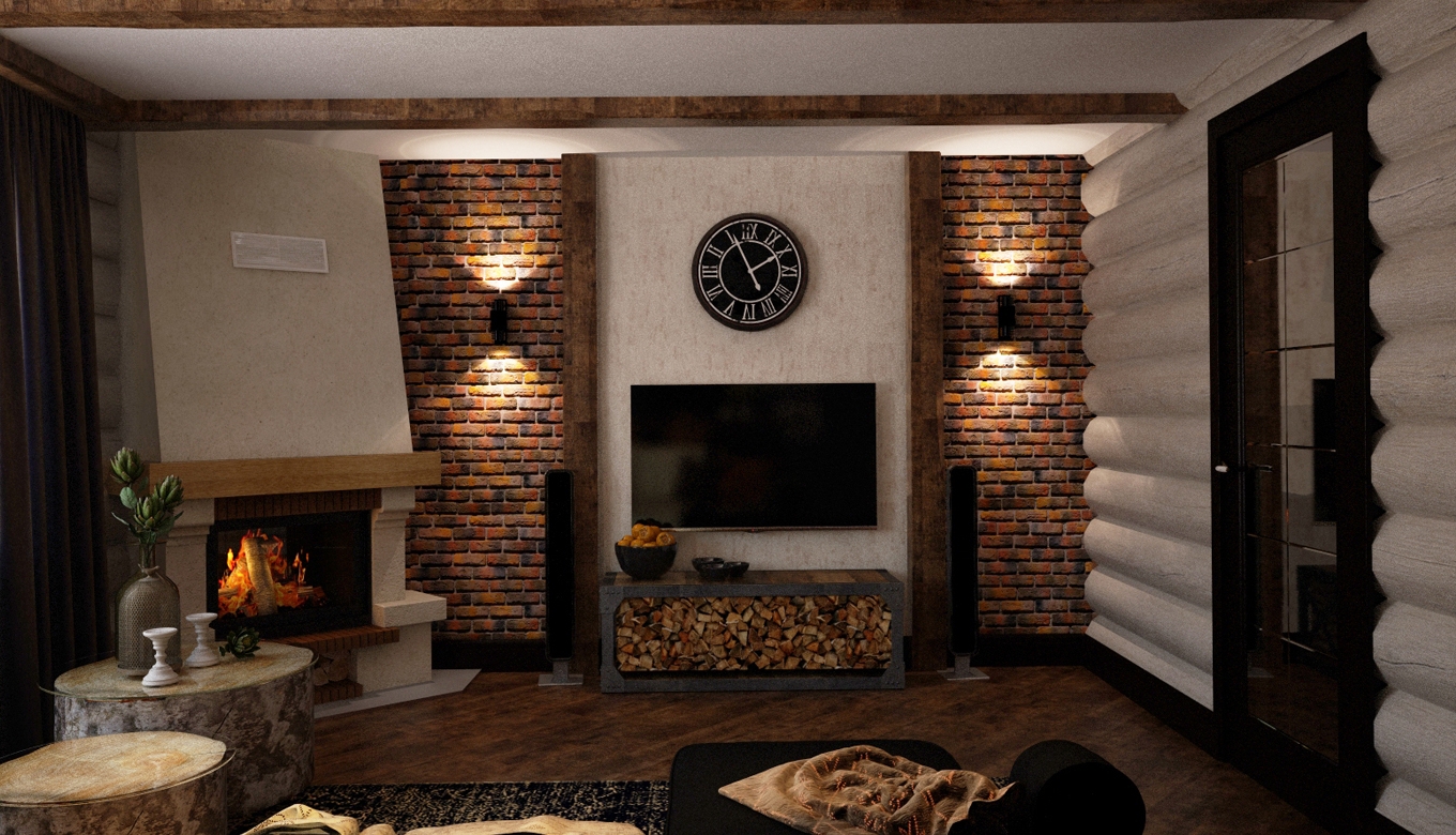 Dieser Innenraum wird gemütlich aussehen. Der Kamin ist aus Backstein oder imitiert ihn einfach. Was Technologie angeht, sollte es nicht zu eingängig und hell sein. TV ist besser an der Wand gegenüber dem Sofa platziert.