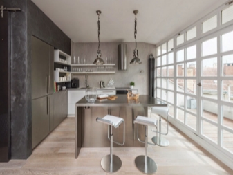 Was die Anordnung der Küche angeht, ist es besser, den Esstisch durch einen Bartresen zu ersetzen. Diese Lösung ist die stilvollste und funktionalste. Außerdem benötigt der Barschalter weniger Platz. Für sie können Sie stilvolle Barhocker kaufen, die jederzeit unter der Tischplatte platziert werden. Der Barzähler ermöglicht das Lösen von Zonen und spart Platz im Raum.