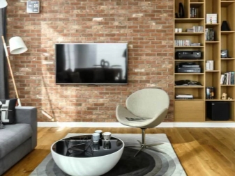 Im Wohnzimmer muss mindestens eine Wand völlig unbehandelt sein, es ist besser für sie, das ursprüngliche Aussehen zurückzugeben. Andere Wände können mit Gips bedeckt werden. Wenn Sie die Wände eines Raumes mit einem hölzernen dekorativen Design machen wollen, dann sollten Sie Plastikpaneele mit Nachahmung der hölzernen Beschaffenheit bevorzugen, aber dieses Material sollte in den minimalen Quantitäten benutzt werden.Wände können Stoff und Leder dekorative Einsätze haben.