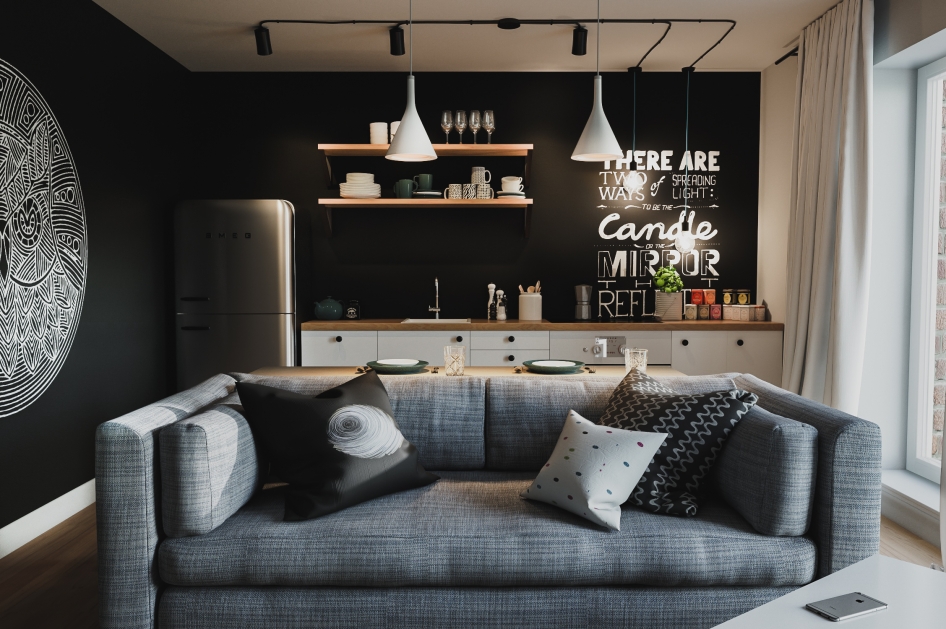 Bei der Anordnung der Wohnung von innen ist es besser, die Möbel nicht wie üblich am Rand des Raumes anzuordnen, sondern wie zufällig. Es sollte nicht an Wände und andere Oberflächen angrenzen. Wenn Sie große Möbel um den Umfang herum platzieren möchten (z. B. ein Sofa), sollte es sich nicht näher als 30 cm von der Wandoberfläche entfernt befinden. Wenn das Innere der Küche besser zu benutzen ist auffällige Hauben und Abzweigrohre.