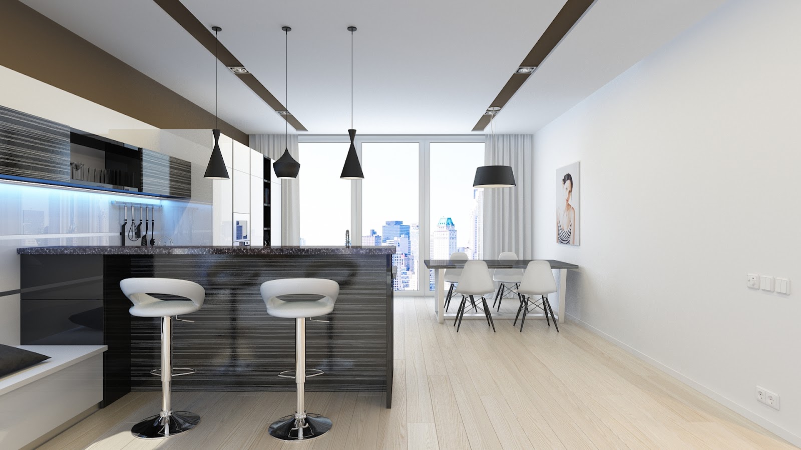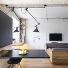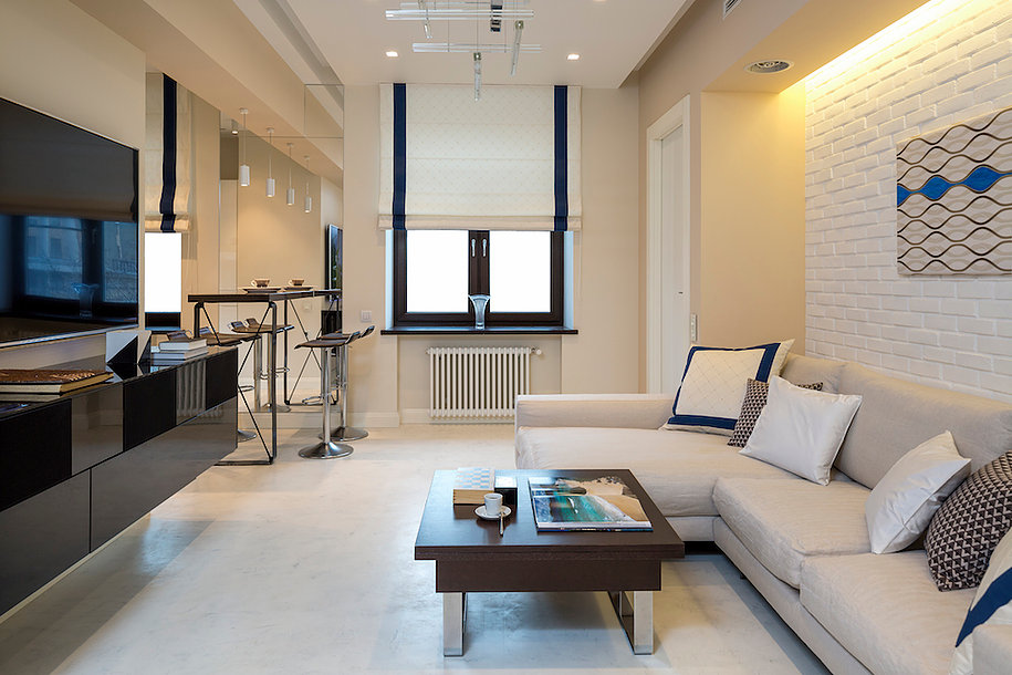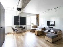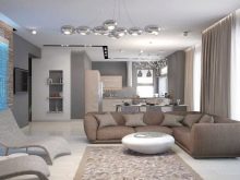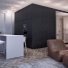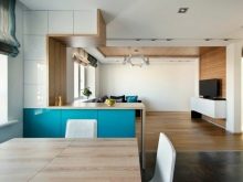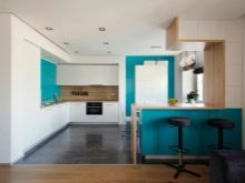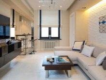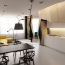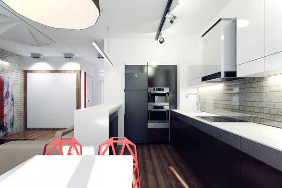 Verbinden Sie die drei Funktionsbereiche - Küche, Esszimmer und Wohnzimmer. In der Küche installieren Sie eingebaute Möbel und Geräte, alle Oberflächen frei.Um die Küche vom Wohnzimmer zu trennen, können Sie die Bar nutzen, die als Essbereich in einer kleinen Wohnung dient.