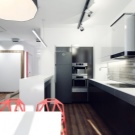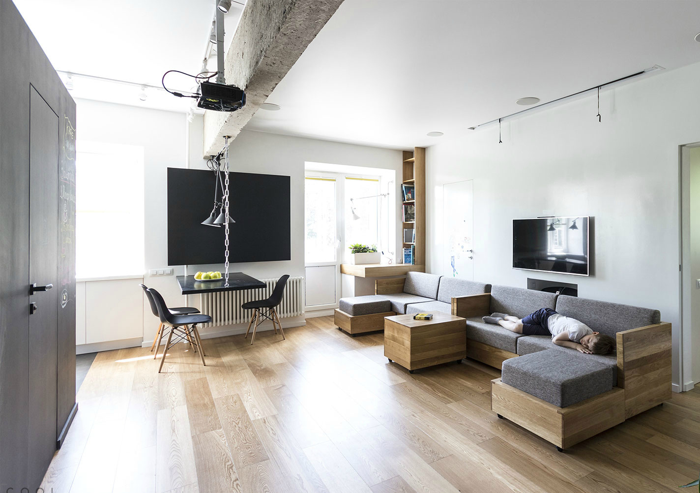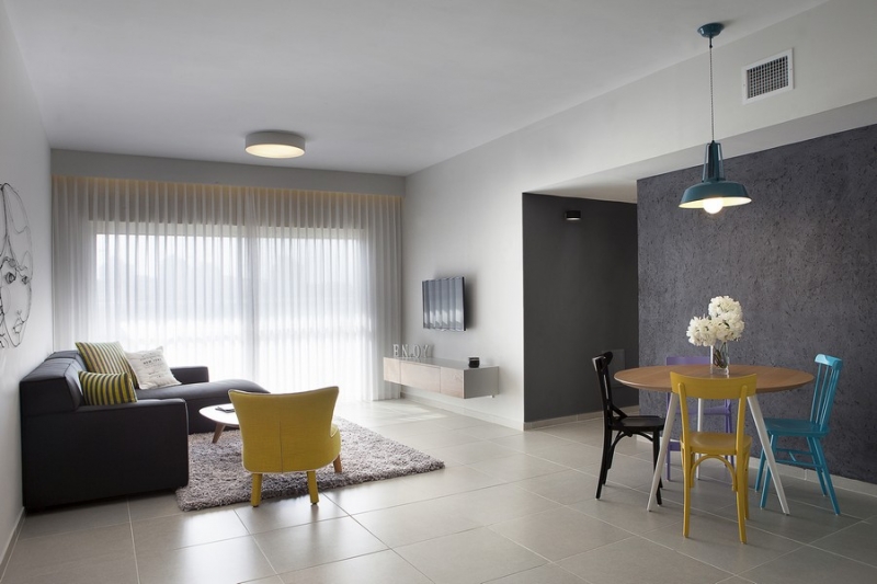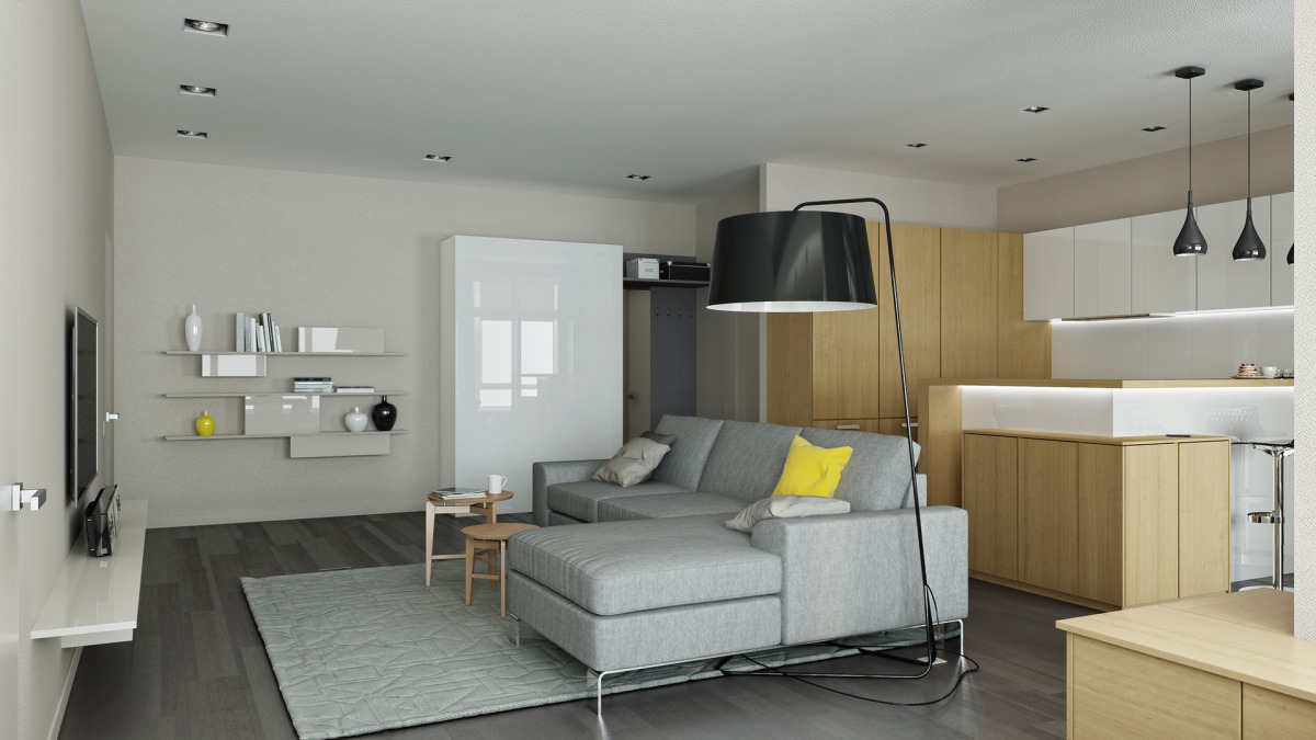 Alle Türen (vom Eingang zu den Schranktüren) sollten gleiten, also bevorzugen Sie die Garderobe. Kombinieren Sie in der Küche den Kochbereich mit dem Essbereich. Vergessen Sie nicht die Einbaugeräte und länglichen Küchensets ohne Griffe.