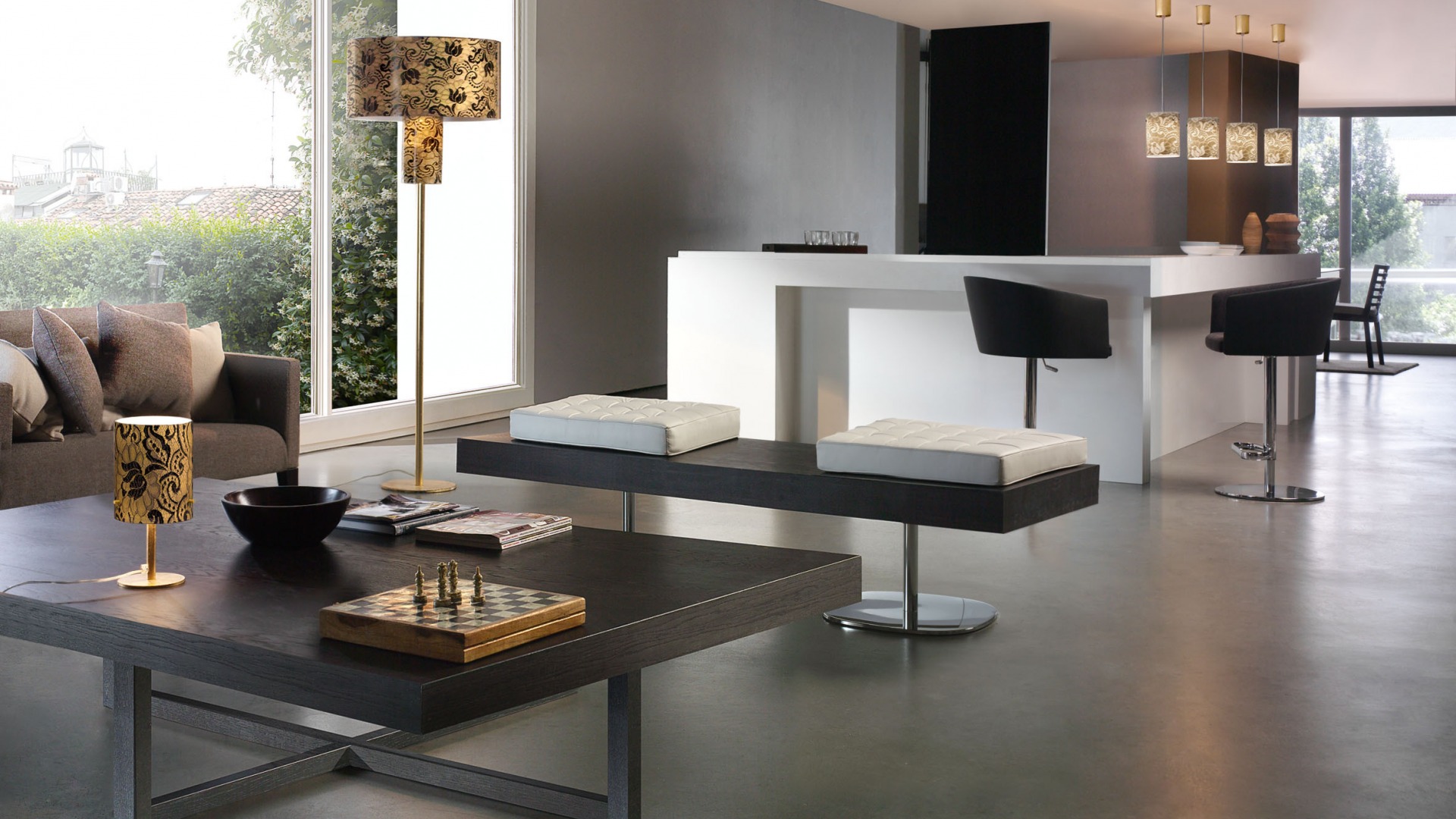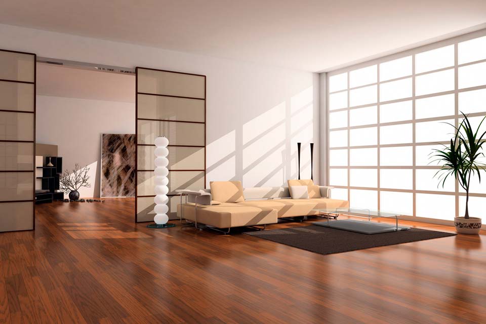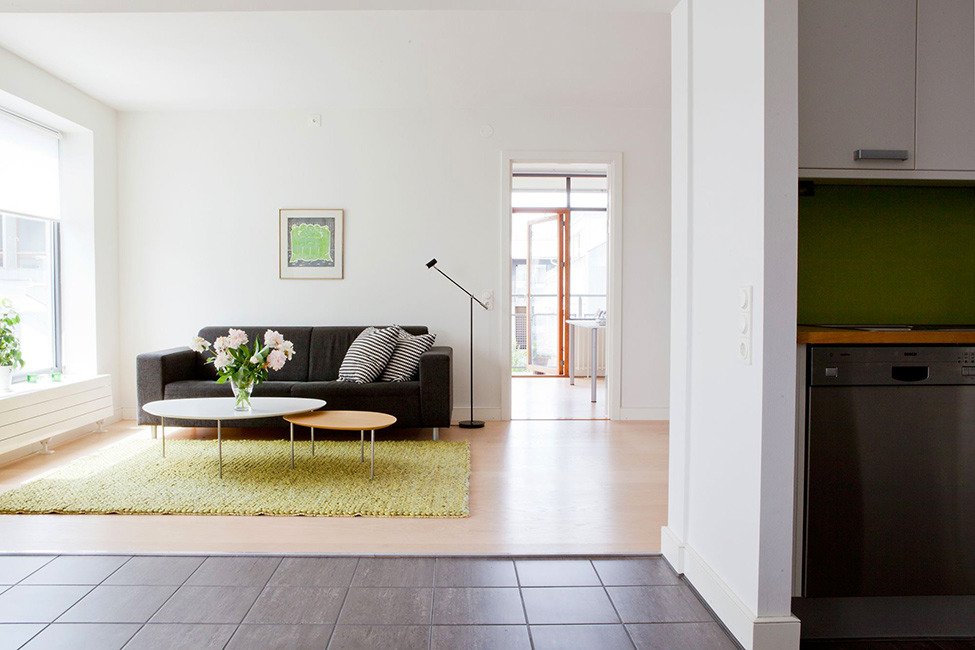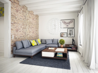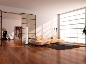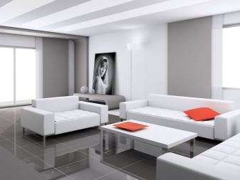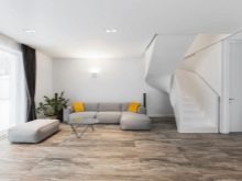 Verwenden Sie möglichst natürliche Materialien oder deren Nachahmung. Es kann ein Stein, Holz, Metall sein. Der Bodenbelag ist besser, um Stein zu machen oder zu verlegenFliese Verwerfe Teppiche und Teppiche, nur ein einziger monolithischer Boden mit einer glänzenden Oberfläche und einem blassen Farbton.