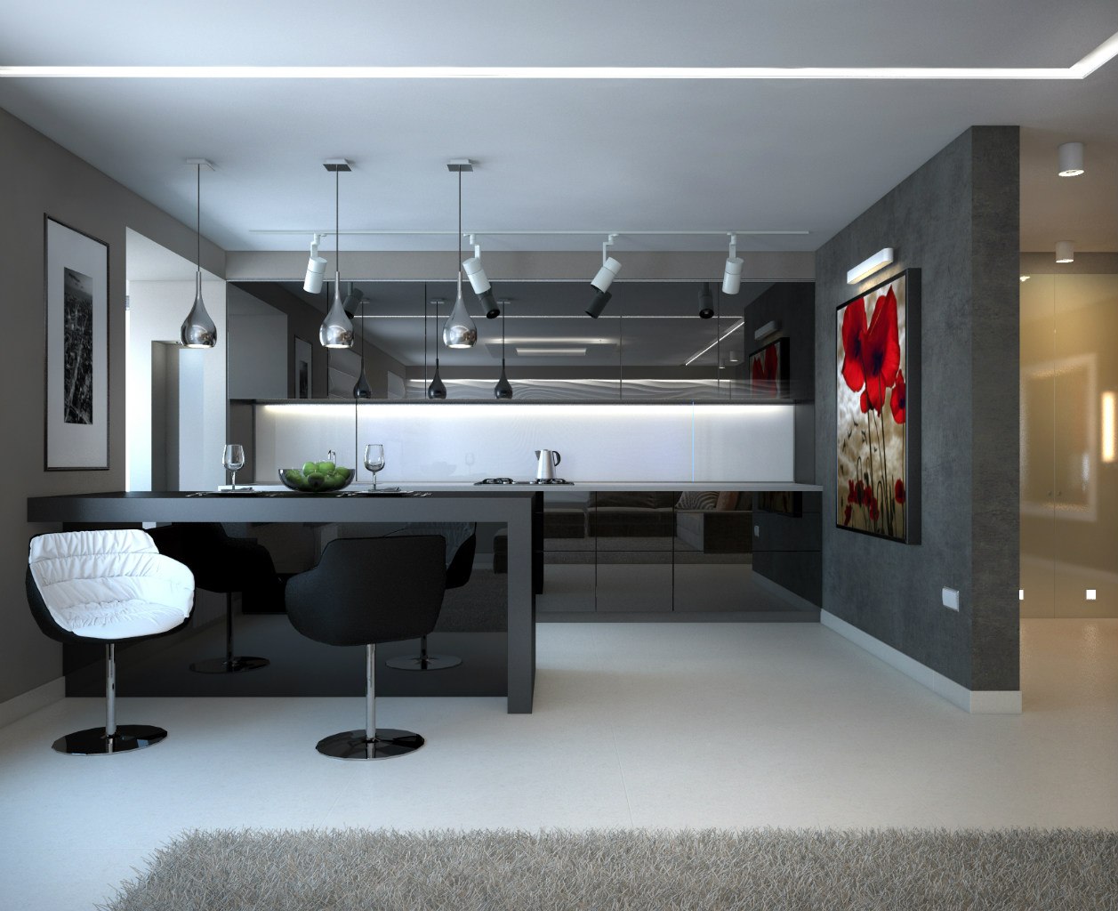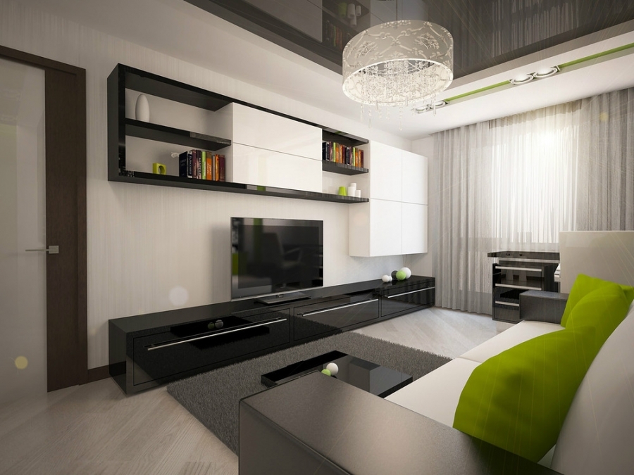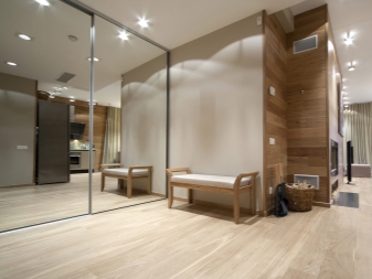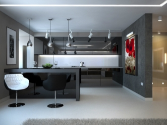 Im Flur, konzentrieren Sie sich auf Spiegel und Hochglanz-Böden, ein verbindliches Attribut - diese Garderobe. Für die Küche wählen Sie längliche, übersichtliche Möbel, die keine scharfen Ecken, Griffe und andere Details haben. Die Möbel im Schlafzimmer sollten einfach sein und den Raum nicht überladen. Eine gute Option wäre ein Klappsofa oder ein niedriges Bett ohne Kopfteil.