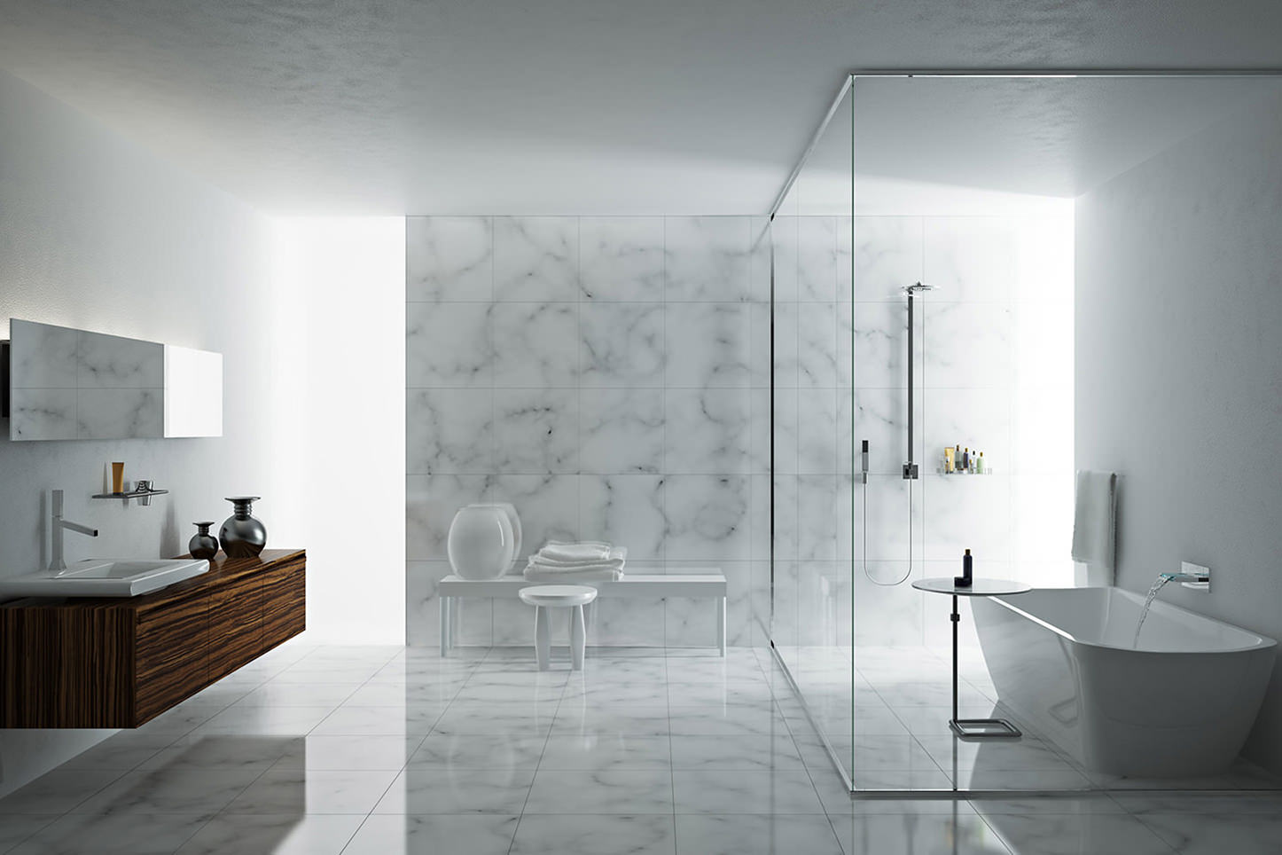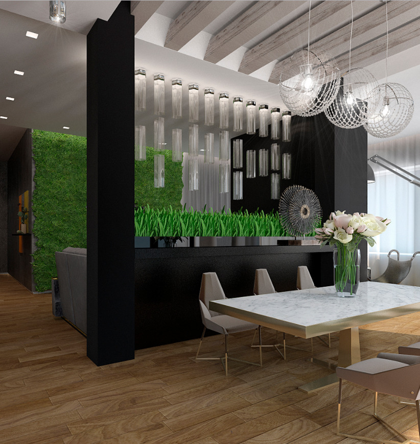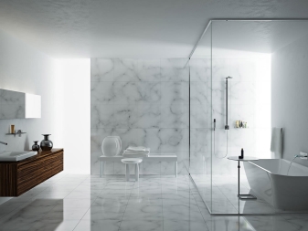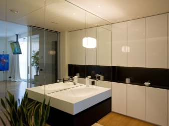 Verwenden Sie im Badezimmer das Finish aus Glas und Metall. Transparente Dusche wird eine großartige Lösung für das Innere sein. Im Wohnzimmer lassen Sie so viel Platz wie möglich unberührt.