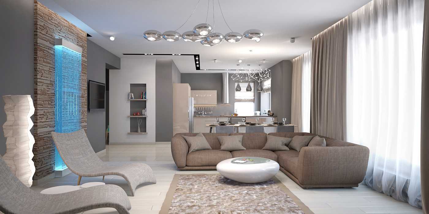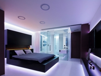 Künstliche Beleuchtung ist auch in jedem Interieur notwendig. Sparen Sie nicht bei der Verwendung einer großen Anzahl von Beleuchtungskörpern. Achten Sie auf die eingebauten Lichter, ordnen Sie sie auf verschiedenen Ebenen an, um den Raum zu zonieren. Der Hi-Tech-Stil verwendet eine Vielzahl von neutralen Diodenlampen.