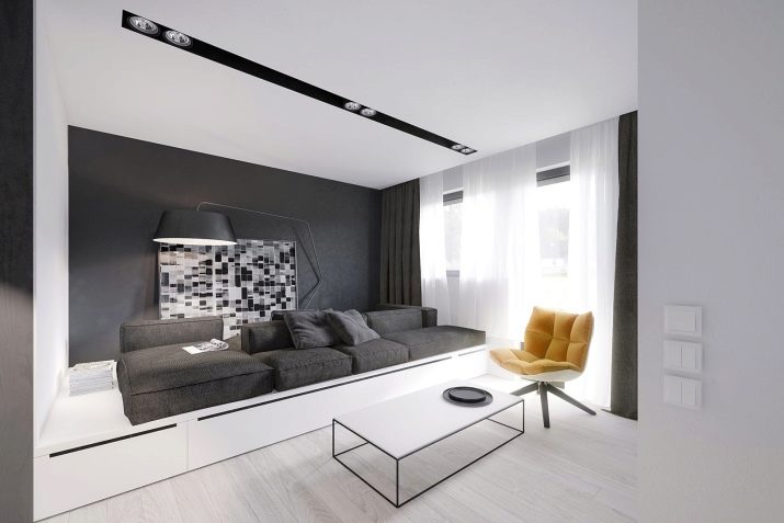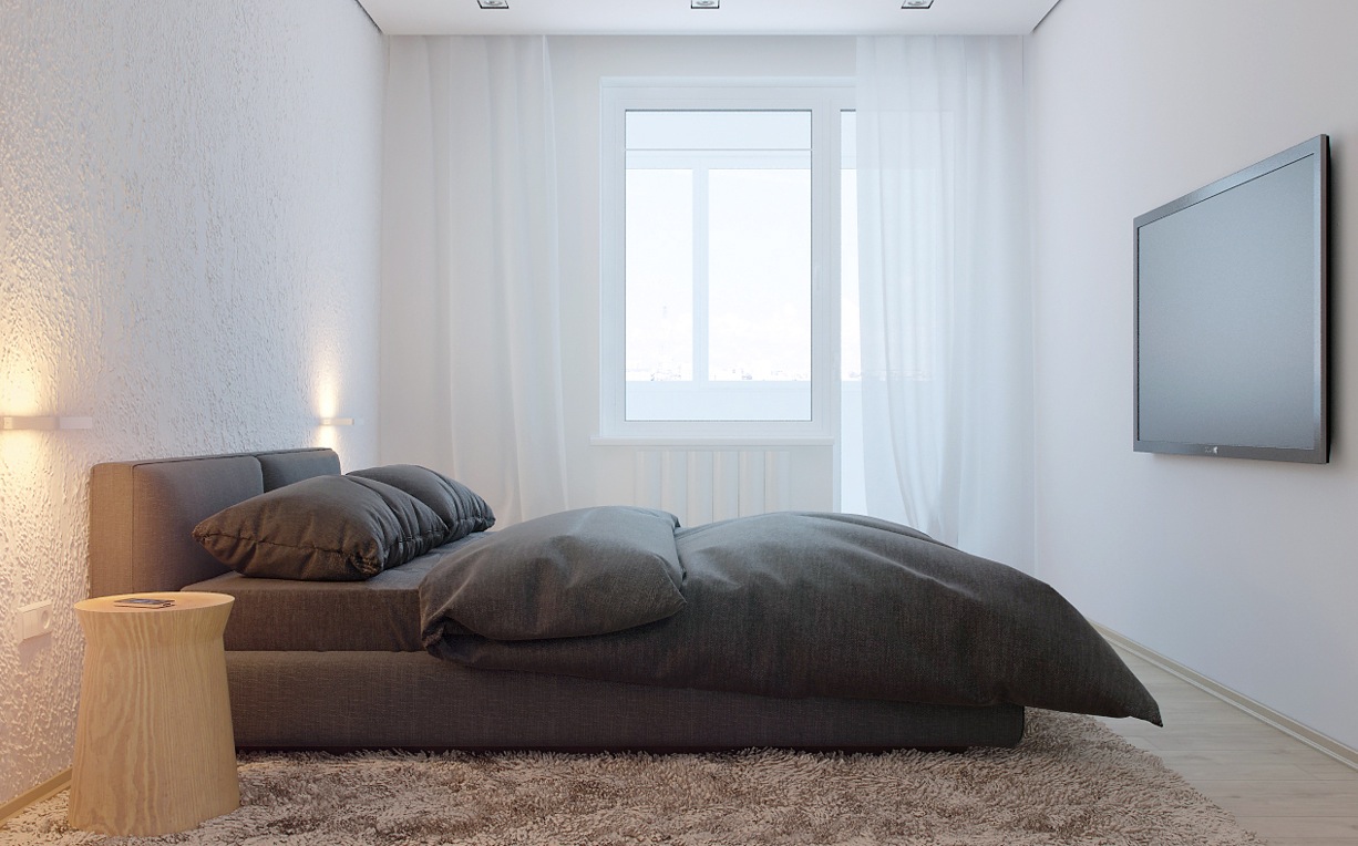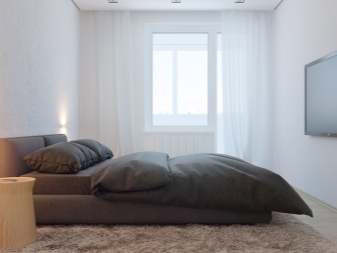 Im Stil des Minimalismus machen Sie kleine 1-Zimmer-Wohnungen, in denen nicht genug Platz ist. Zuallererst ist es notwendig, den Raum richtig zu zonieren, die Designer bieten an, Trennwände und unnötige Wände sicher loszuwerden und einen gemeinsamen freien Raum zu schaffen. Richten Sie ein Schlafzimmer in einem separaten kleinen Raum ein. In ihm können Sie mit einem niedrigen Bett, Nachttisch und Kleiderschrank tun.