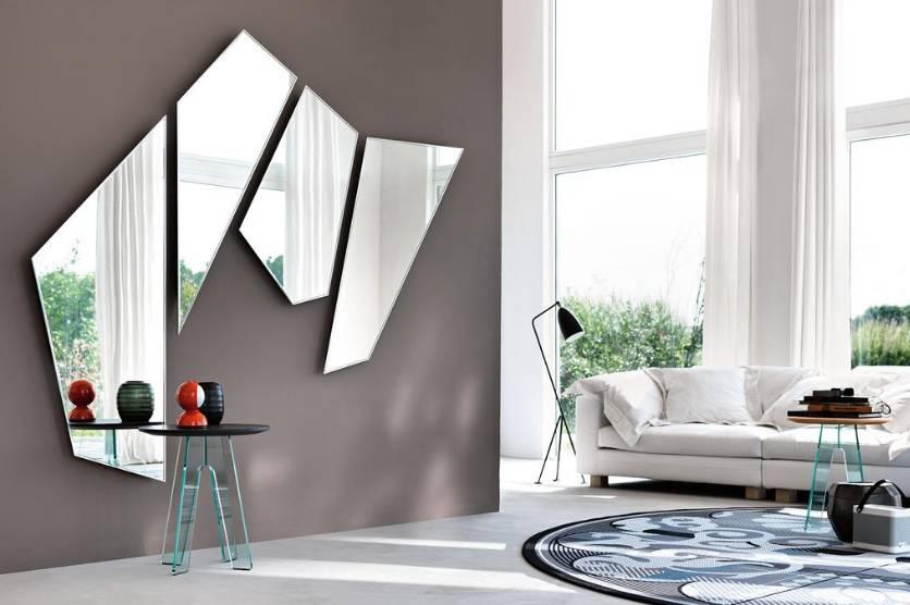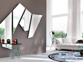 In der modernen Paneelwohnung ist es sehr beliebt, das Interieur mit Hilfe von schicken Spiegeln komplexer geometrischer Formen (Achtecke, Dreiecke, Fünfecke) zu dekorieren. Spiegel sind normalerweise konvex und flach und haben keine Rahmen. Die Tische und Regale schienen aus den konstruktivistischen Skizzen verschwunden zu sein: eine Vielzahl geometrischer Formen, ein Spiel der Symmetrie und ein Durcheinander von Linien.