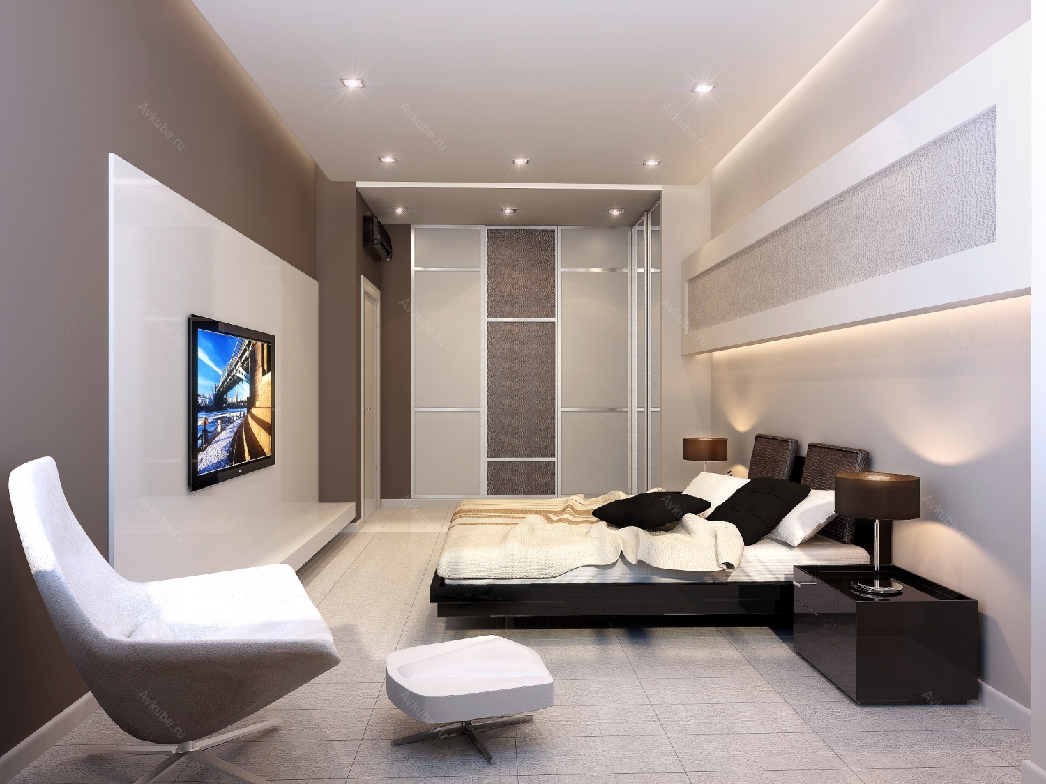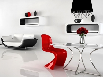 Vergessen Sie nicht den Komfort für das Leben und die Funktionalität. Verwenden Sie im Ablagebereich Organizer, Tissueboxen und Kleiderbügel. Wanduhr ist besser zu wählen, aus Metall oder glänzendem Kunststoff. Die Anordnung mehrerer asketischer Leuchter, Chromständer, originaler Vasen und Schalen ist angebracht.