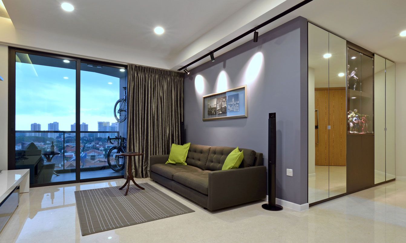 Von den Möbeln in das Wohnzimmer passen ein kleines Sofa, ein bescheidener Hocker und ein Couchtisch aus Glas.