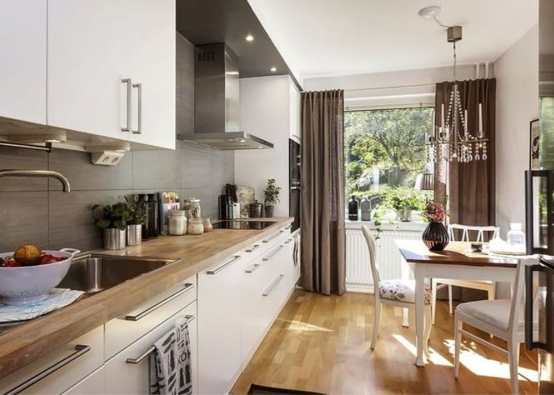 - Das einfachste Küchenset aus Holz wird einfach selbst zu machen sein. Für kleine Dorfhäuser werden jedoch häufig moderne Designs mit eingebauten Geräten gewählt, die jedoch am besten in einem Geschäft gekauft oder auf Bestellung hergestellt werden. Sie können einen Ofen, Dunstabzugshaube, Herd und sogar einen Kühlschrank integrieren - diese Lösung ermöglicht es Ihnen, den Raum so vollständig wie möglich zu nutzen.