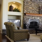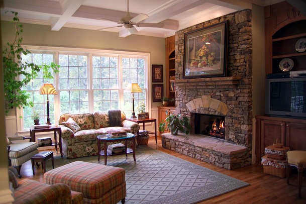 Country-Stil, heute sehr modern, erfüllt den Traum eines komfortablen Landhauses. Der Kamin aus einem großen Natur- oder Kunststein in Naturtönen passt ideal in dieses Interieur. Sie können den Rahmen nicht begrenzen, und verwenden Sie einen Stein in der Gestaltung der Wand, erstellen Sie ein kleines Regal oder legen Sie die Fensterbänke.
