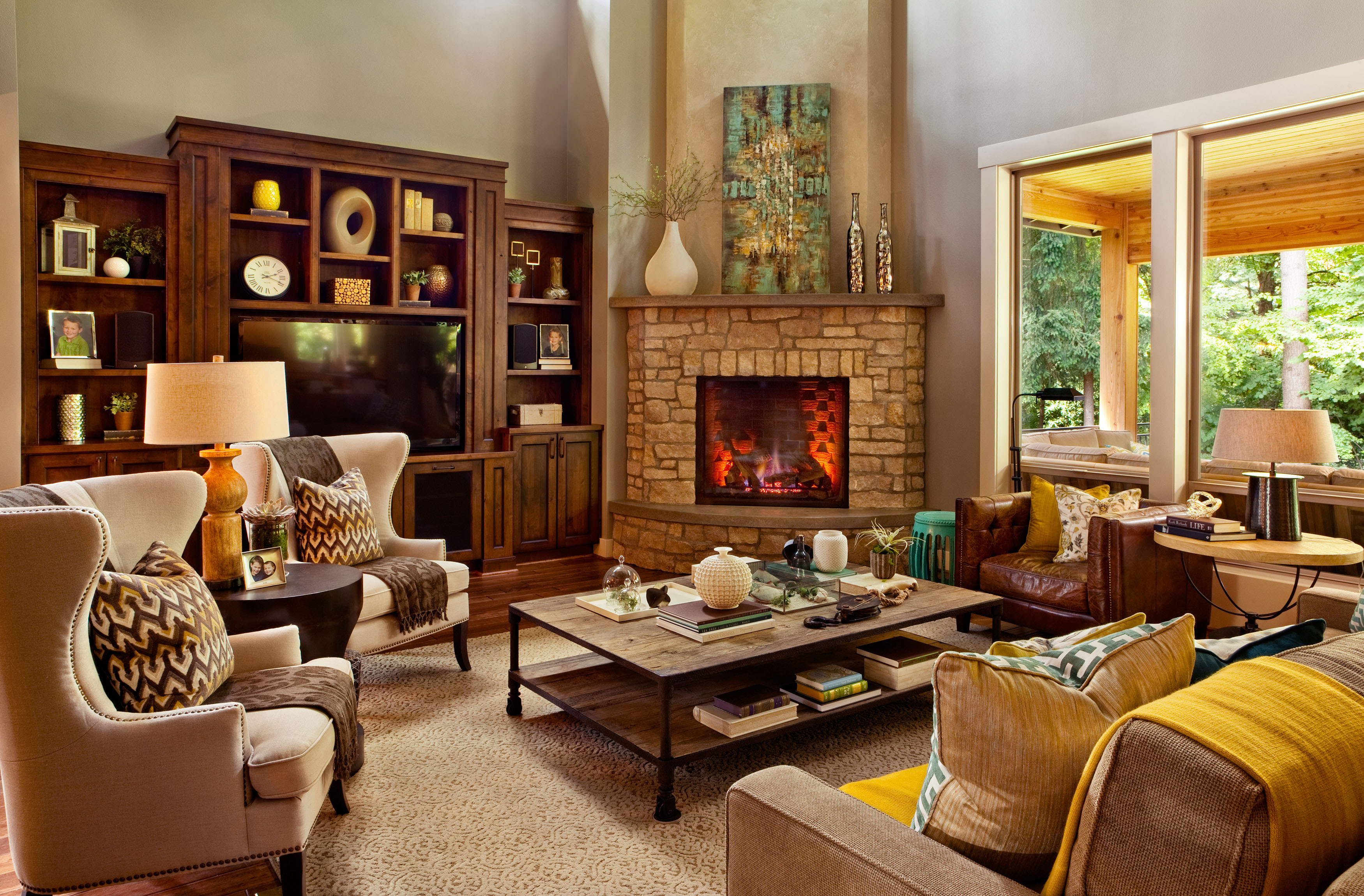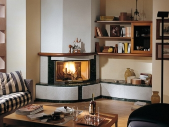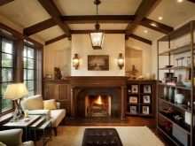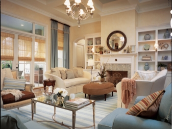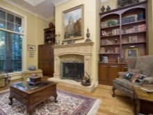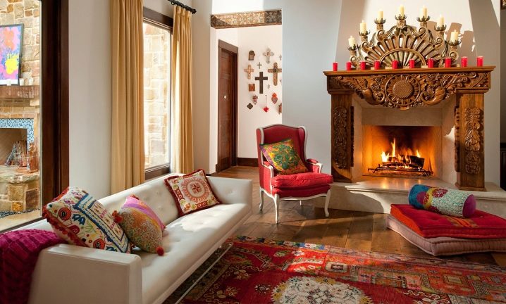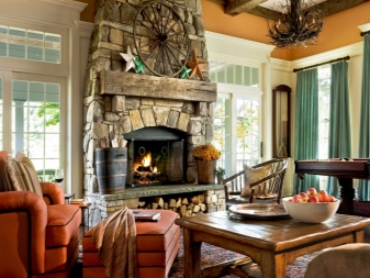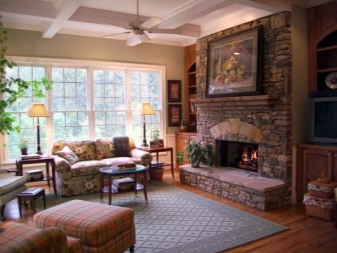 Es ist möglich, eine eckige Version der Kamineinheit zu installieren, besonders wenn das Wohnzimmer klein ist. Bei der Möbelwahl sollte man vor allem kräftige Holzsessel mit massiven Armlehnen, breite Tische für alle Verwandten und Gäste bevorzugen. Sie sollten einen rohen Baum wählen, Im Inneren können Sie verschiedene ethnische Details verwenden. Polster, Kissen, Vorhänge an den Fenstern ist besser, aus einem groben Stoff mit einem Blumendruck, wie Tapisserie und Leinen zu wählen.
