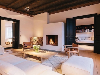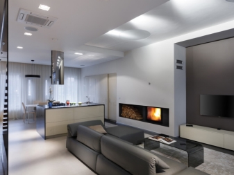 Die Hauptfarben des Interieurs sind Creme, Beige, Weiß, Grau und Aschen. Eine Besonderheit dieses Stils ist die maximale Offenheit des Raumes und der minimale Gebrauch von dekorativen Elementen.Die Paneelwände der Halle sind am besten mit einer solchen Kamineinrichtung ausgestattet.
