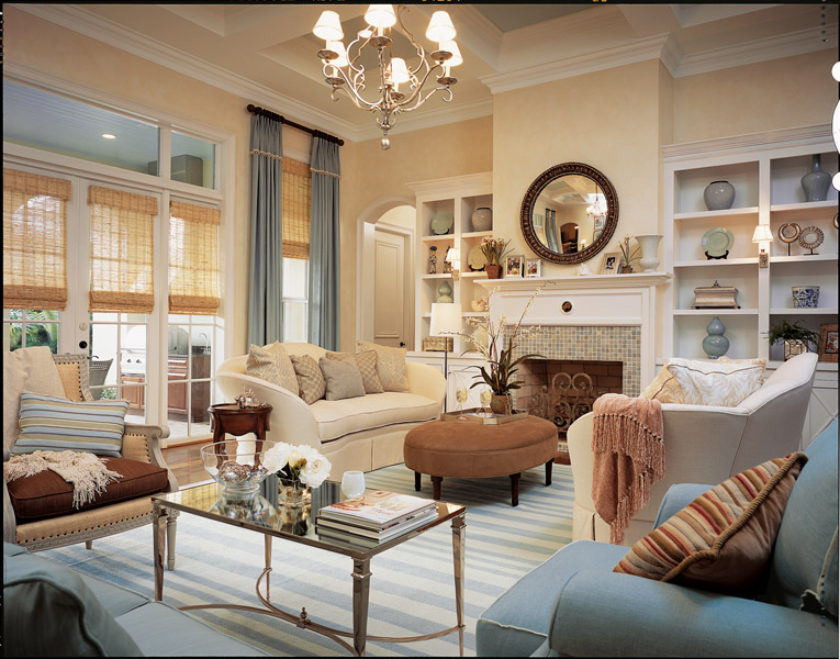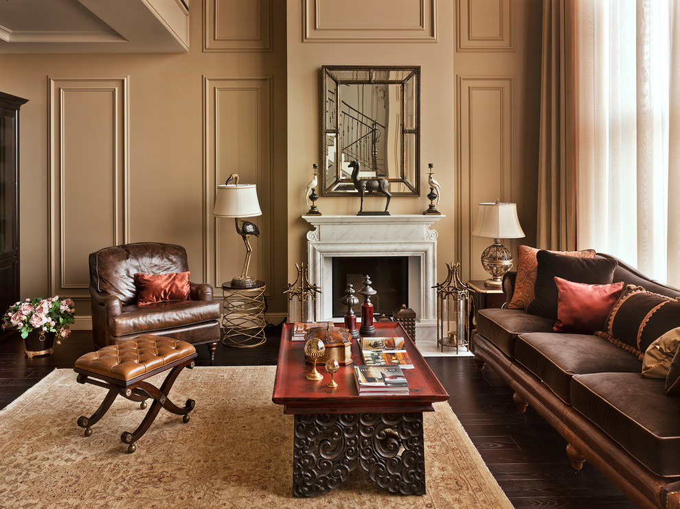 Ein wichtiger Bestandteil des Dekors sind Bücherregale, eine Fülle von Kissen, Porzellanobjekte.Meist verwendete beige, Honig, Creme, dunkelrote Farben.