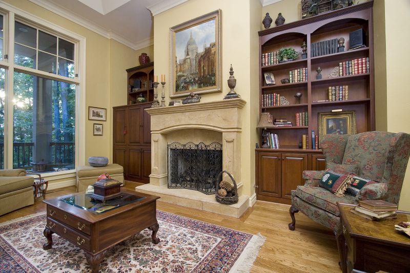 Gültig mit Stuckdekoration. Solide klassische Holzmöbel und Spiegel mit Holzrahmen sind ideal für einen klassischen Kamin. Um dieses Detail des Innenraums zu unterstützen, können antike Uhren, anmutige Figuren und natürlich Familienfotos über dem Kamin hängen.