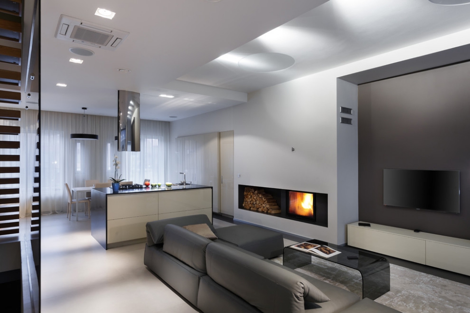 Ein Wohnzimmer im High-Tech-Stil ist ohne Fernseher und andere technische Geräte kaum vorstellbar, denn dieses Interieur betont moderne Technik, die auch Dekor ist. In diesem Fall ist es wichtig, die Platzierung der Monitore so zu planen, dass die Blendung durch das Feuer im Kamin nicht auf den Bildschirm fällt.