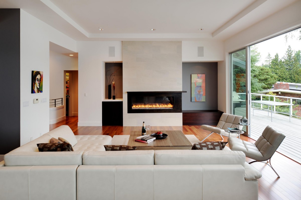 Design-Wohnzimmer mit Kamin im Haus: schöne Beispiele des Innenraums