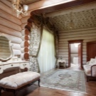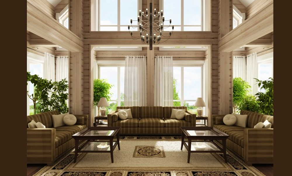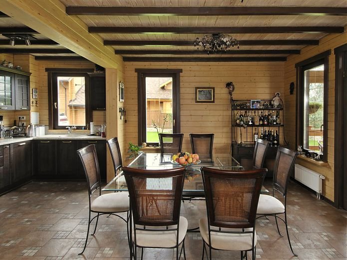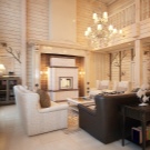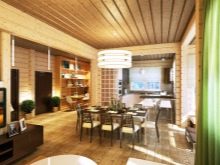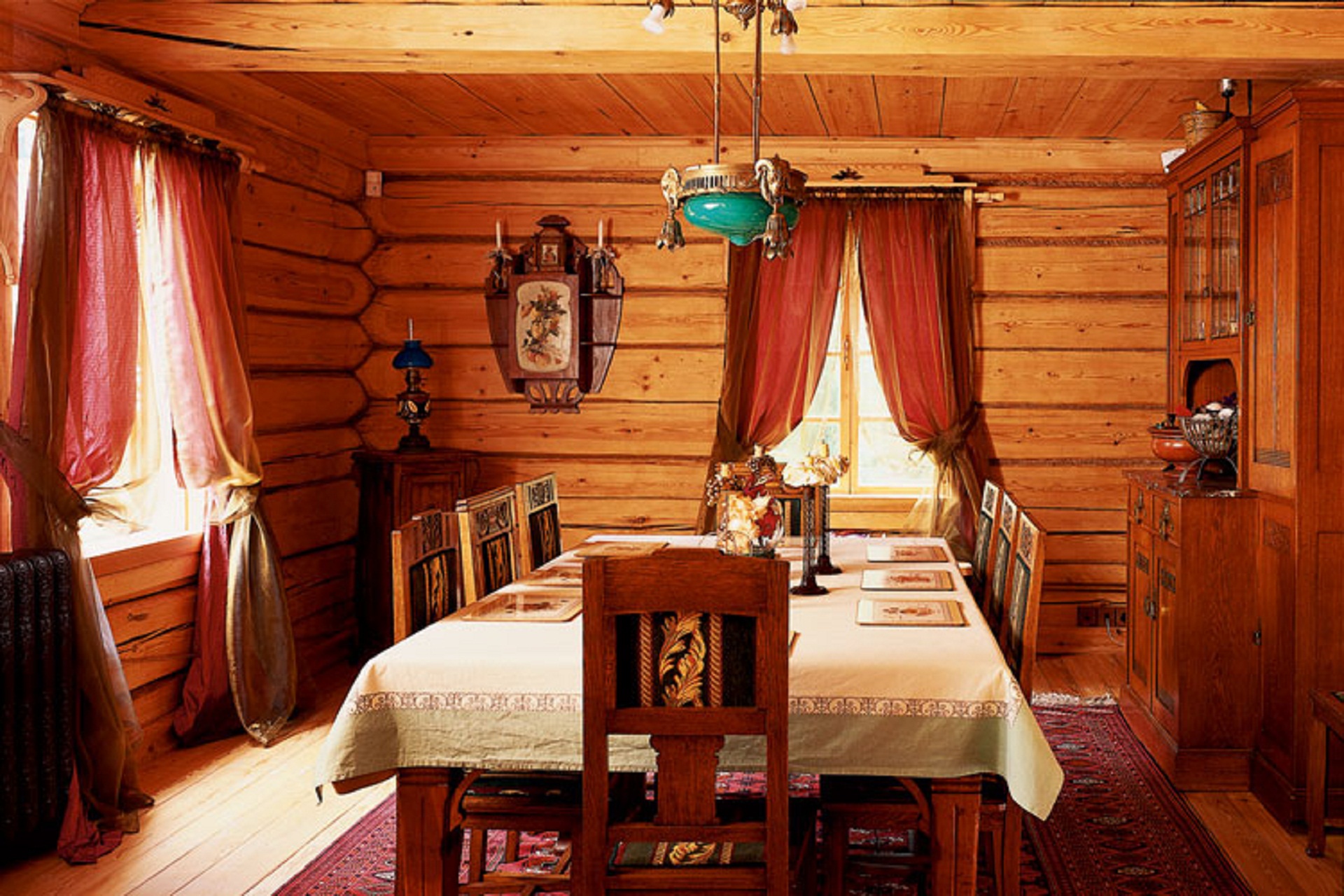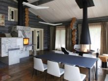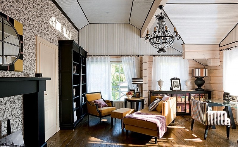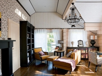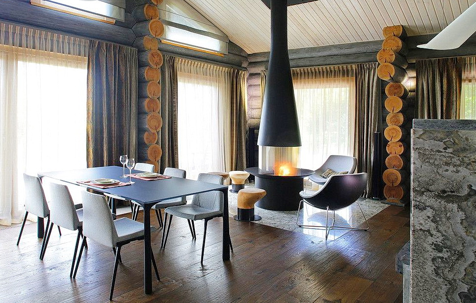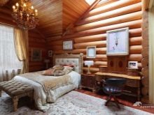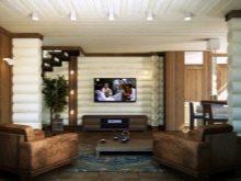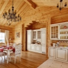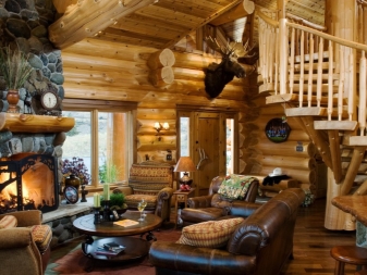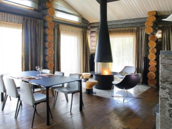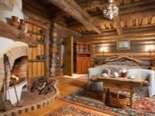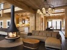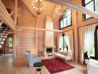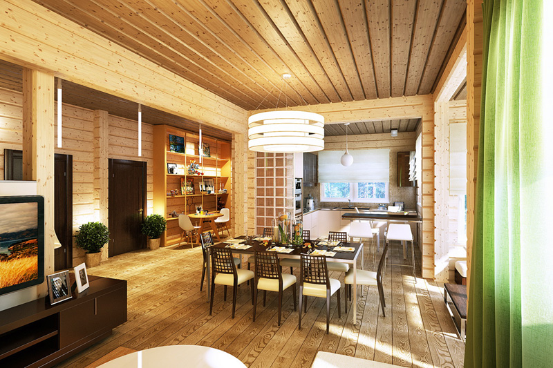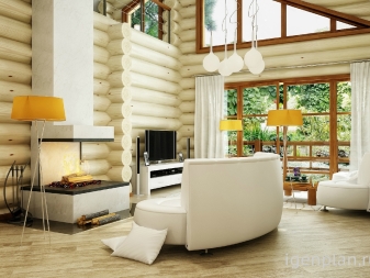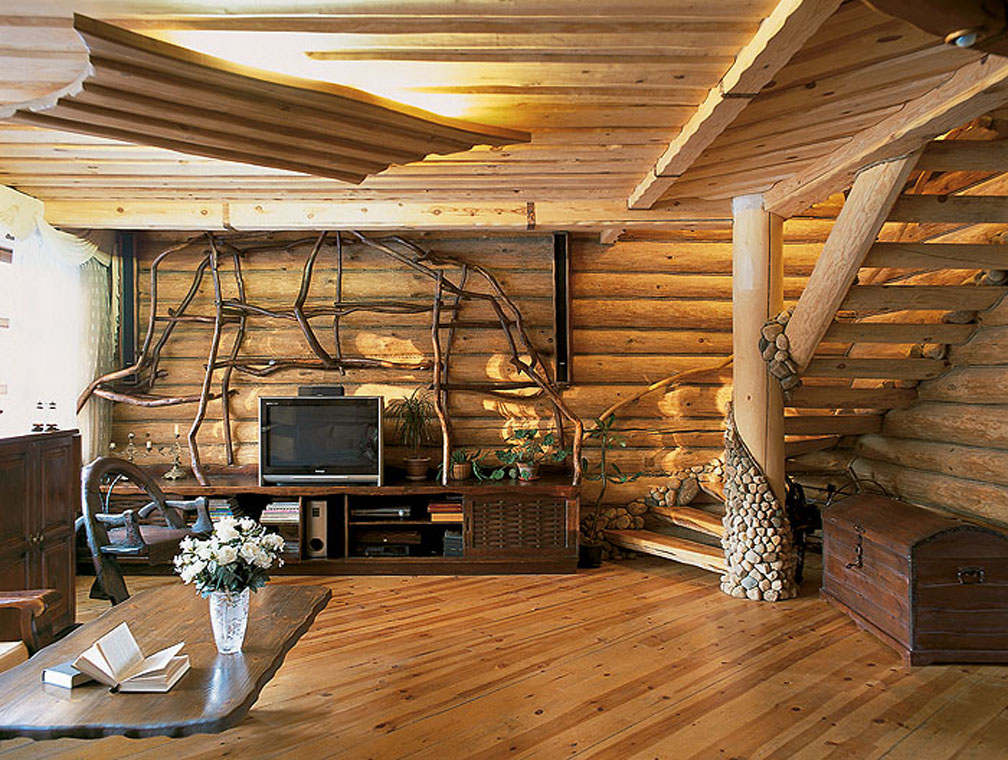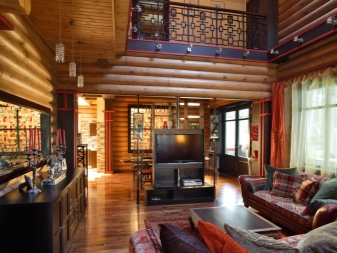 Landhaus aus Holz ist ein einzigartiges Gehäuse, so dass sein Interieur unvorhersehbar und originell dekoriert werden kann. Um die Schönheit eines natürlichen Baumstamms besonders hervorzuheben, empfehlen die Planer, die Räume zusätzlich mit verchromtem Metall und Glas auszustatten. Hilfsrolle im Innenraum wird auch kleine Dekorelemente und Zimmerpflanzen haben. Hausbesitzer können die am besten geeignete Design-Option für sie nach ihren Wünschen wählen, ihre ungewöhnlichen Ideen bringen und ihre Fantasien darin verwirklichen.