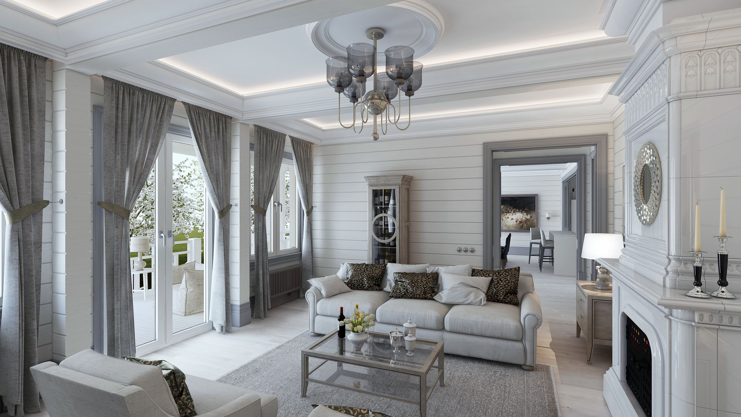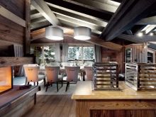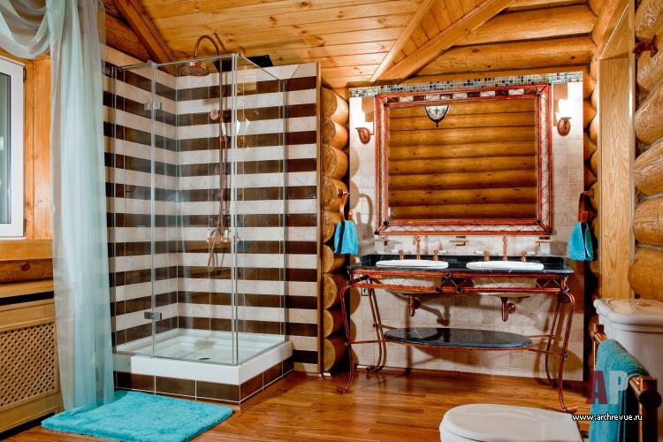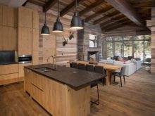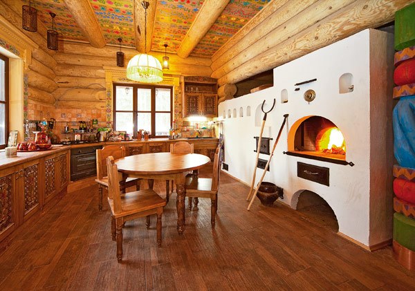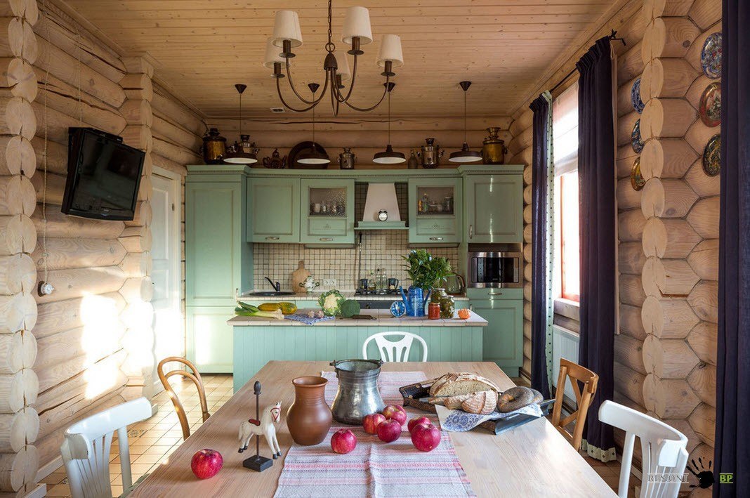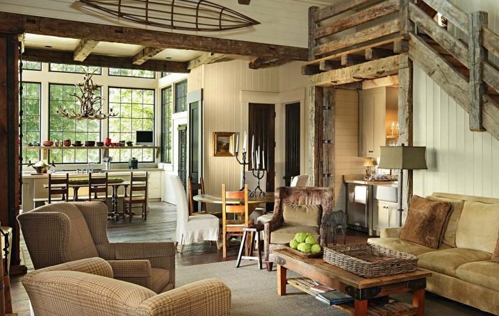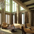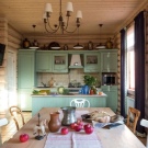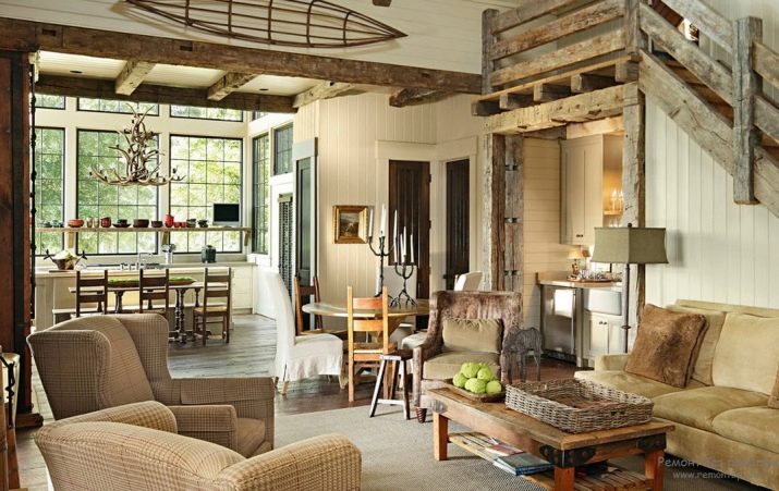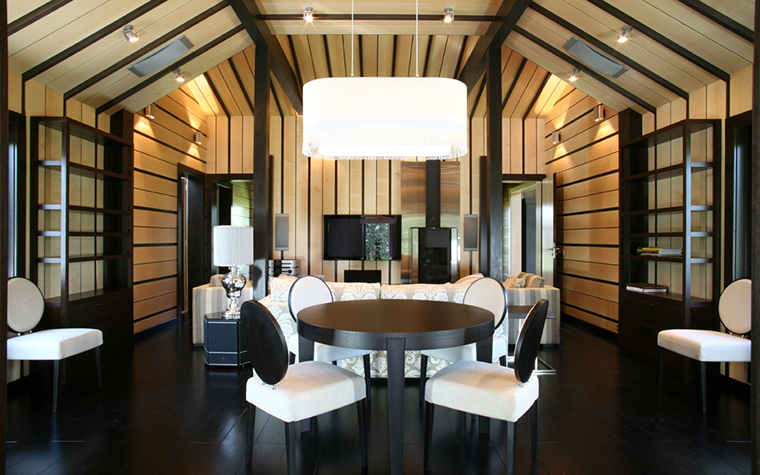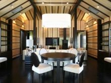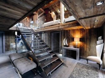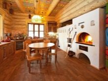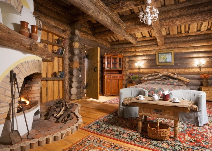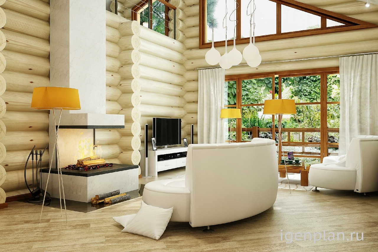 Landhaus aus Holz ist ein einzigartiges Gehäuse, so dass sein Interieur unvorhersehbar und originell dekoriert werden kann. Um die Schönheit eines natürlichen Baumstamms besonders hervorzuheben, empfehlen die Planer, die Räume zusätzlich mit verchromtem Metall und Glas auszustatten. Hilfsrolle im Innenraum wird auch kleine Dekorelemente und Zimmerpflanzen haben. Hausbesitzer können die am besten geeignete Design-Option für sie nach ihren Wünschen wählen, ihre ungewöhnlichen Ideen bringen und ihre Fantasien darin verwirklichen.