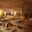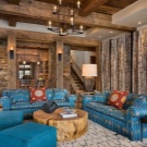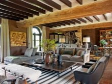 - Jagdgründe. Diese Option ist großartig für die Organisation des Inneren des Hauses, wo ein einzelner Mann lebt, wie für Frauen solche Einrichtung wird unhöflich und düster erscheinen. Riesige Sofas aus Leder, geschmiedete Lampen, ein Kamin und Tierhäute an den Wänden gelten als Hauptindikatoren des thematischen Designs. Die Decken sind oft mit Hängepaneelen dekoriert und eine zentrale Sitzecke steht neben dem Kamin. Die Räume sollten eine gedämpfte Beleuchtung haben, und die Fenster sind am besten mit Vorhängen aus dicken Stoffen dekoriert.