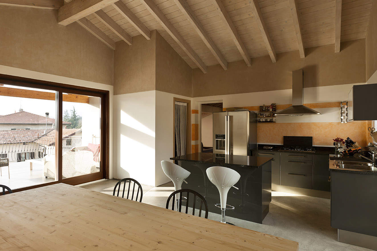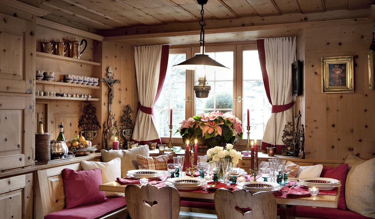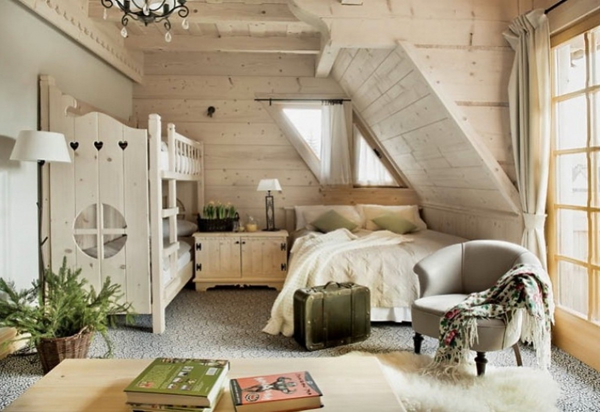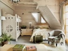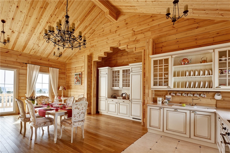 Pastellfarben werden auch als eine gute Option angesehen, sie werden normalerweise für die Wanddekoration gewählt. Die Decken in Blockhäusern sind mit Balken versehen, und als Bodenbelag werden Bretter, Parkett oder Laminat verwendet.
