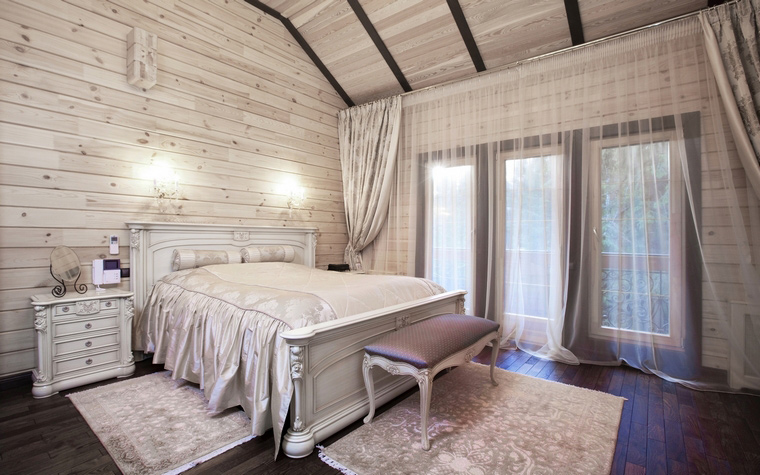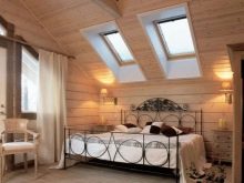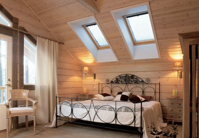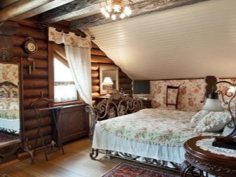 Die Helligkeit der Beleuchtung hängt von der Gestaltung der Fenster im Holzhaus ab, daher ist es notwendig, dass sie die Vorhänge und Vorhänge richtig auswählen. Wenn das Licht im Raum gedämpft werden soll, empfiehlt es sich, Rollos aus dicken Stoffen zu verwenden. Im gleichen Fall, wenn das Zimmer dunkel und langweilig aussieht, benötigen Sie Licht und durchbrochene Vorhänge. Ein besonderer Look wird dem Interieur kurze Vorhänge verleihen, ergänzt durch transluzenten Tüll.