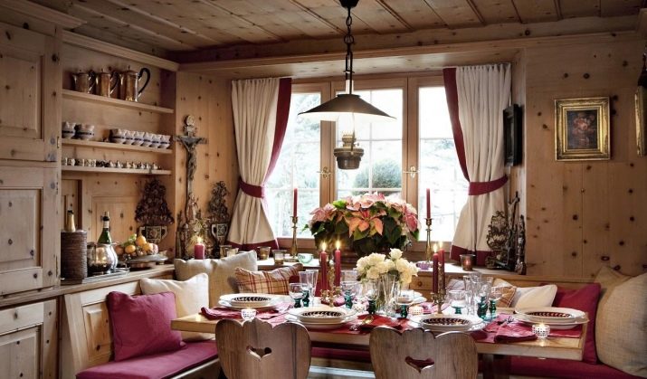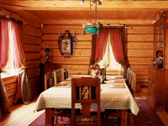 Um einen raffinierten Stil in einem Holzhaus zu schaffen, ist es am besten, Vorhänge mit Strumpfhaltern und Zopf zu wählen. Eine gute Option zum Dekorieren von Fenstern ist Lambrequin, aber seine Modelle sollten nicht zu üppig sein.
