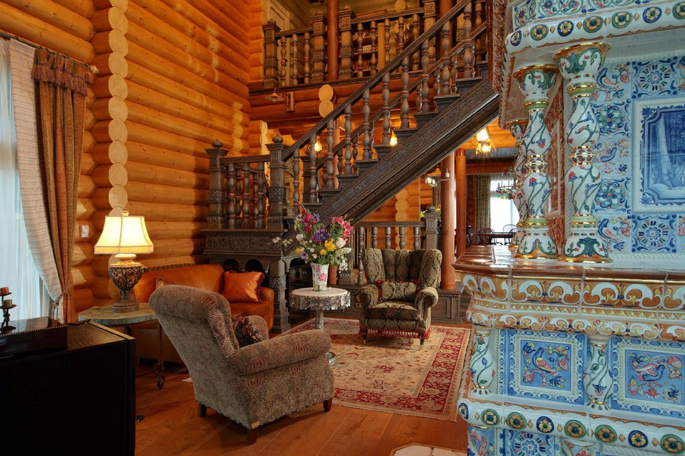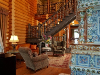 - Russischer Stil. Es ist sehr beliebt, weil es Ihnen ermöglicht, einer Holzkonstruktion ein gemütliches Aussehen zu geben.Das Hauptmerkmal dieses Designs wird als "saubere" Wand betrachtet, das heißt, sie versuchen nicht zu dekorieren und hinterlassen die natürliche Schönheit des Baumes. Um die Textur des Materials weiter hervorzuheben, werden die Wände mit speziellen Lösungen behandelt, die die Oberfläche der Stäbe glänzend und haltbar machen. In solchen Häusern gibt es notwendigerweise sowohl weibliche als auch männliche Designnoten, zum Beispiel können Jagdtrophäen und ein russischer Ofen harmonisch in demselben Raum untergebracht werden. Die Dekoration des Hauses sind Gemälde, geschnitzte Möbel und Treppen.