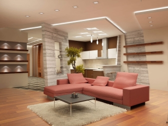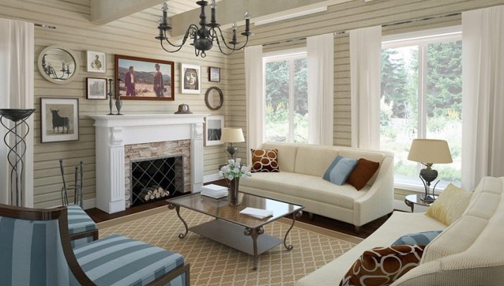 Die ungewöhnlichste Lösung für ein Landhaus wird die Zoneneinteilung sein, die es Ihnen ermöglicht, eine vollwertige Ecke zum Entspannen, Lesen von Büchern und Festen zu organisieren. In diesem Fall sollten die Wände im Raum in einem natürlichen Schatten gehalten werden, leichte Möbel aufnehmen und mit Blumen dekorieren. Kamin im Zimmer wird die Atmosphäre von zu Hause Wärme geben. Um den Raum zu beleuchten, sollten die Fenster mit einem kleinen Vorhang verziert werden und zusätzliche Lichter sollten an der Decke installiert werden.
