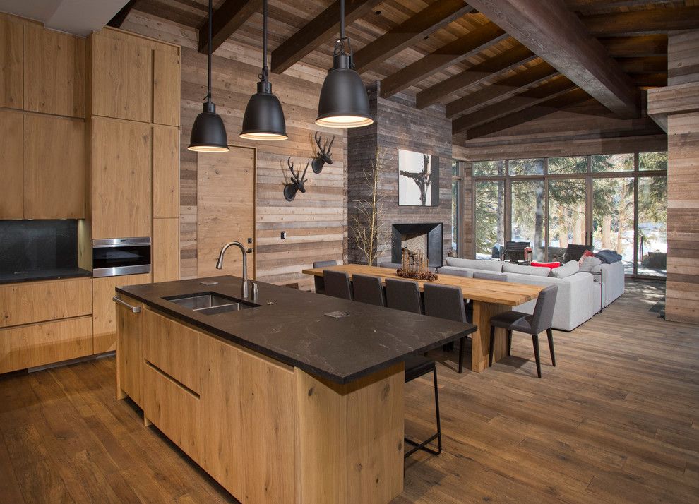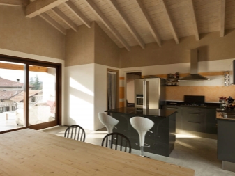 Darüber hinaus empfehlen Designer, Stein-, Ziegel- oder Holzpaneele als Wanddekoration anzubringen.Gleiches gilt für den Bodenbelag, denn er eignet sich gut als Laminat, Parkettboden und Steinimitat. Die Decken können mit Holzbalken oder mit speziellen Massivholzplatten verkleidet werden. Gleichzeitig können Sie mobile Partitionen aus Stammholz installieren.
