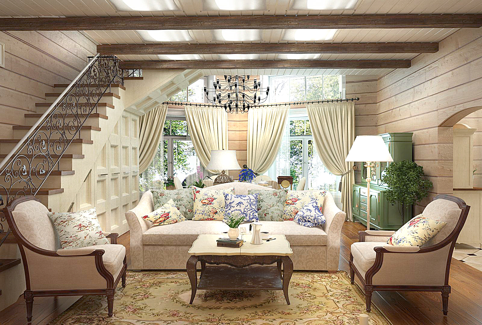 - Land Dieses Design ist einzigartig, da es ursprünglich Funktionalität, Originalität und Komfort vereint. In solchen Räumen finden Sie antike Möbel, schöne Textilien, Handstickerei und viele verschiedene "Nippsachen". Gleichzeitig müssen Antiquitäten in Maßen verwendet werden, damit gemütliche Räume nicht zum "Laden" werden. Das Hauptthema bei der Gestaltung von Räumen sind Deckenplatten aus natürlichen massiven und gewölbten Öffnungen, Balken können an den Decken vorhanden sein.