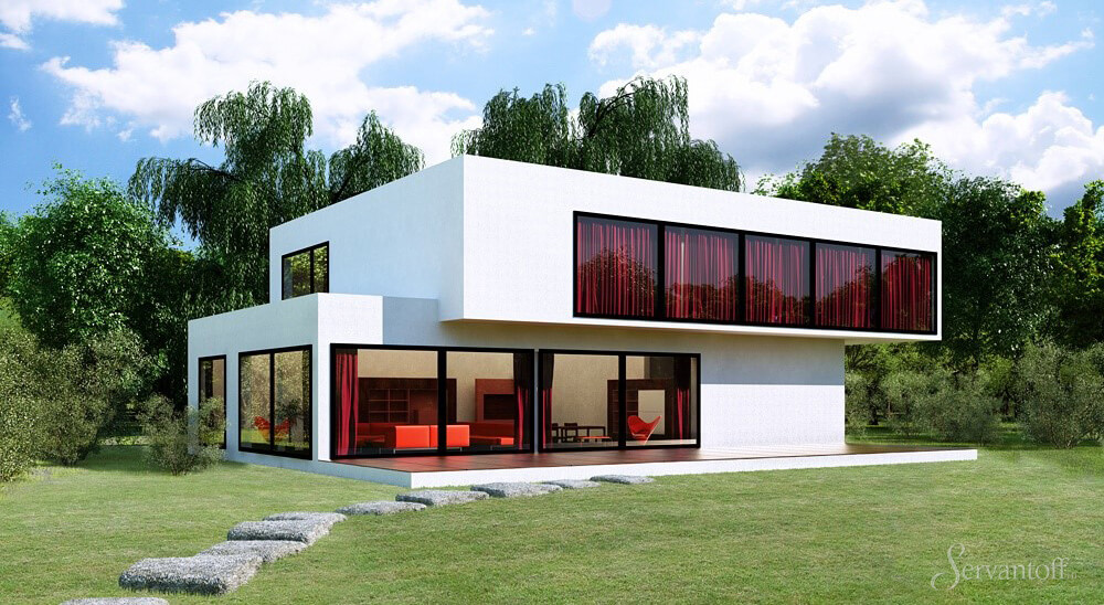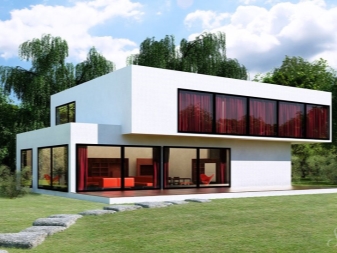 High-Tech-Häuser sind sehr beliebt. Sie zeichnen sich durch die Einführung moderner Technologien, alternativer Materialien und Ausführungsvarianten in unser Leben aus. Oft ist die gesamte Wand von Panoramafenstern eingenommen. Das Dach ist mit einer Steigung angeordnet. Das Gebäude selbst ist eine rechteckige Struktur mit strengen Linien.