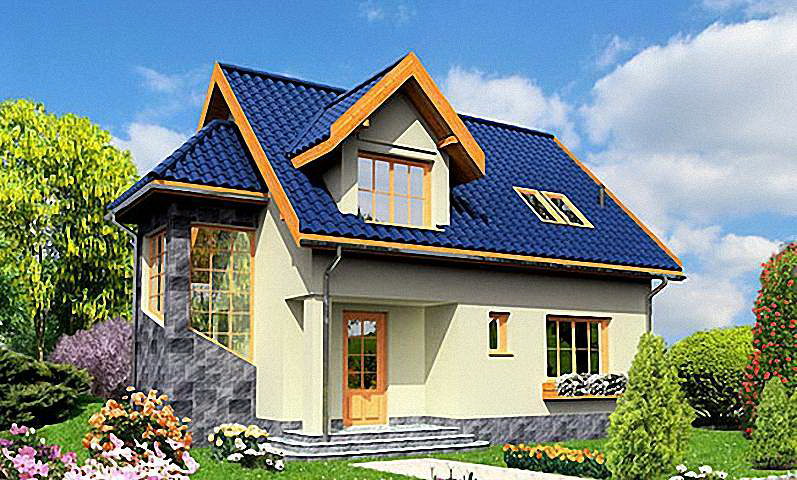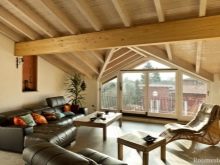 - Dachdesign kann den Raum um 90% vergrößern. Gebrochene Giebelsysteme sind bevorzugt. Dies ermöglicht es, eine abgehängte Decke zu machen, um Lampen auf Aufhängungen zu verwenden, Möbel frei zu ordnen.