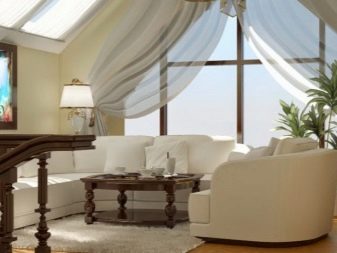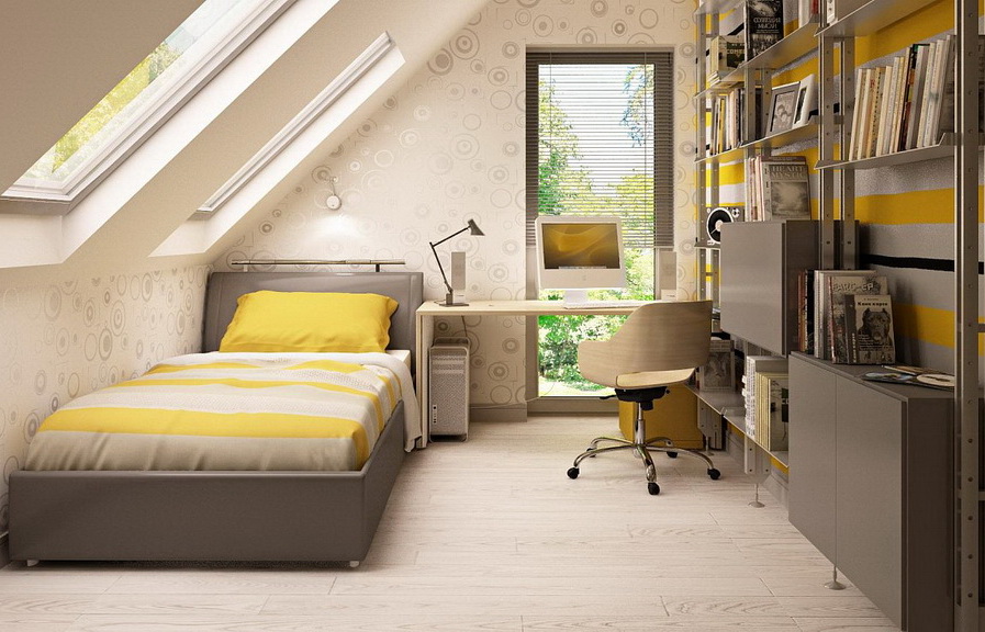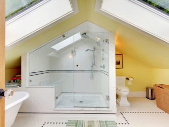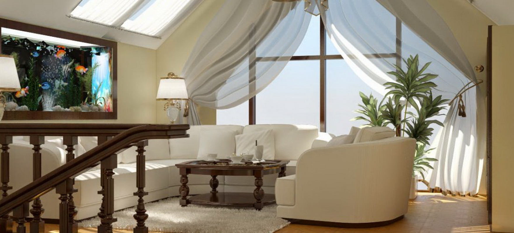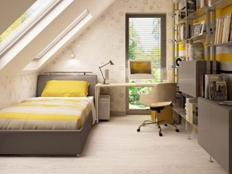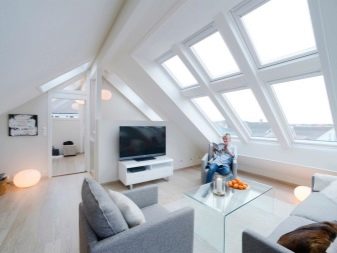 Ein weiterer ungewöhnlicher Faktor ist das Vorhandensein von Fenstern an der Decke oder schrägen Hängen. In der Regel sind sie klein und liefern kein Licht in der richtigen Menge. Aus diesem Grund müssen Sie den Raum bewusst in hellen Farben gestalten oder die komplexe Perspektive der Räume optisch herausziehen.