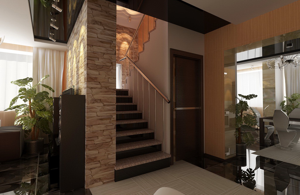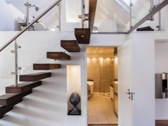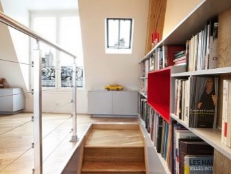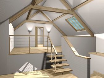 Ein weiteres Merkmal eines einstöckigen Hauses mit einem Dachboden ist die obligatorische Anwesenheit einer Treppe. Es ist das Bindeglied zwischen dem Erdgeschoss und dem Dachboden. In diesem Fall kann der Dachboden aus mehreren Räumen bestehen oder einer, der einem offenen Grundriss ähnelt.