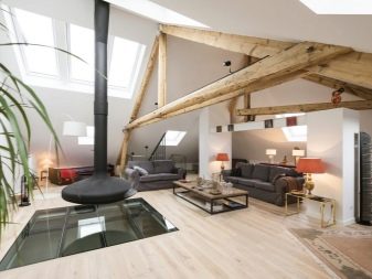 - Mit einer sorgfältigen Annäherung an das Design können Sie einen Kamin installieren. Dies verleiht dem Dachboden eine gemütliche Atmosphäre und ermöglicht es, ihn für einen komfortablen Ruheplatz zu nutzen.