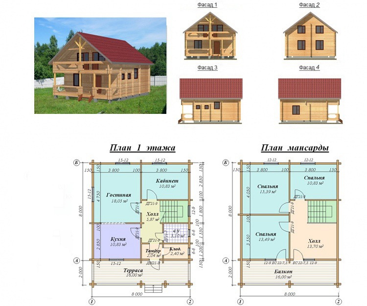 - 10 von 8 m. Privathaus aus Holz, im Erdgeschoss gibt es ein Wohnzimmer, Arbeitszimmer, Küche, Flur, Bad und Abstellraum. Der Plan des Dachgeschosses umfasst 3 Schlafzimmer, eine Halle und einen Balkon.