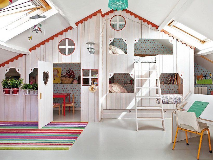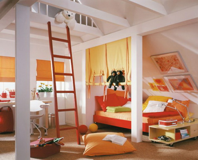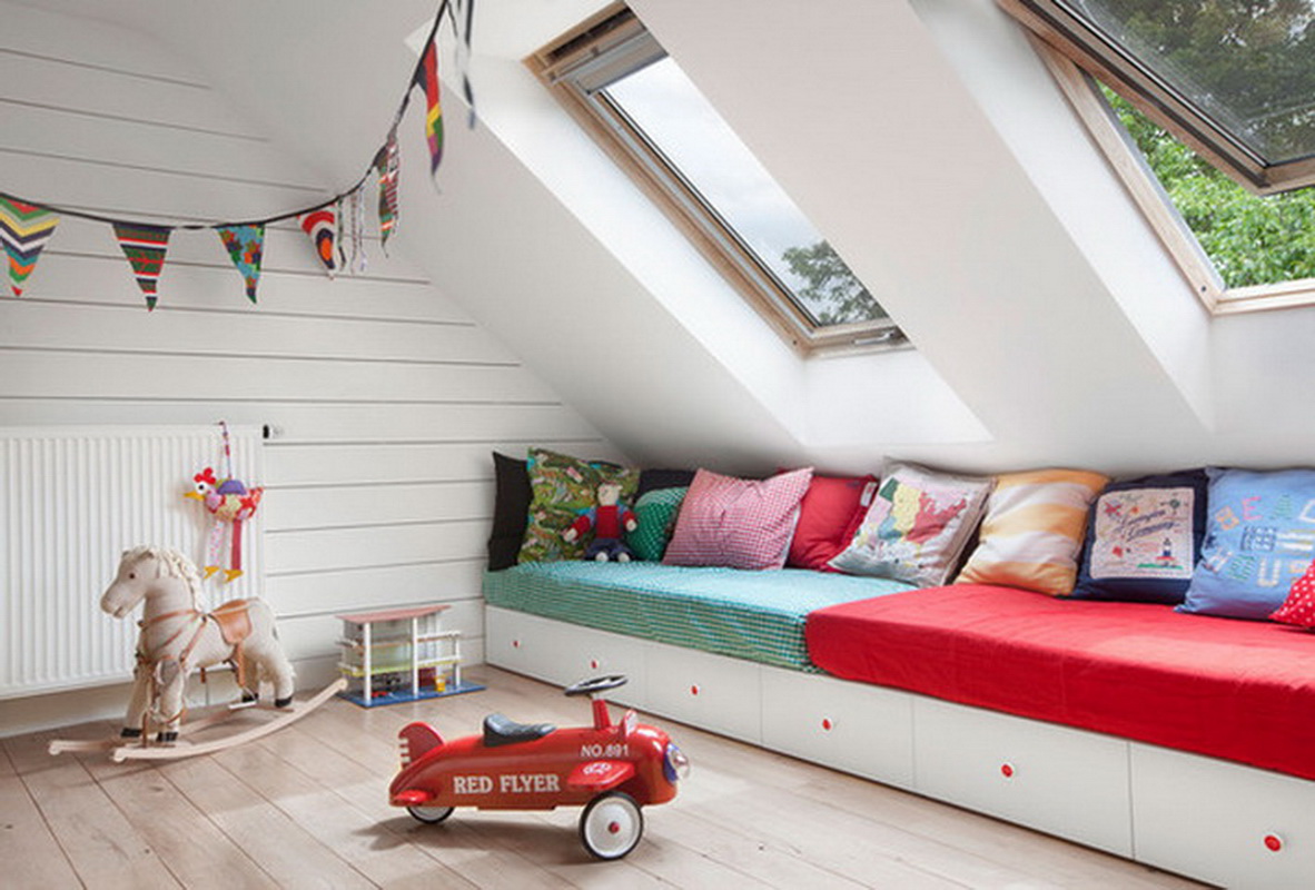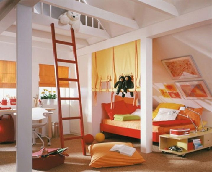 - Eine der ursprünglichen Lösungen - Anordnung des Dachbodens unter der Baumschule. Die tragenden Säulen und Balken sind weiß gestrichen, die Verwendung warmer Farben macht den Raum gemütlich.