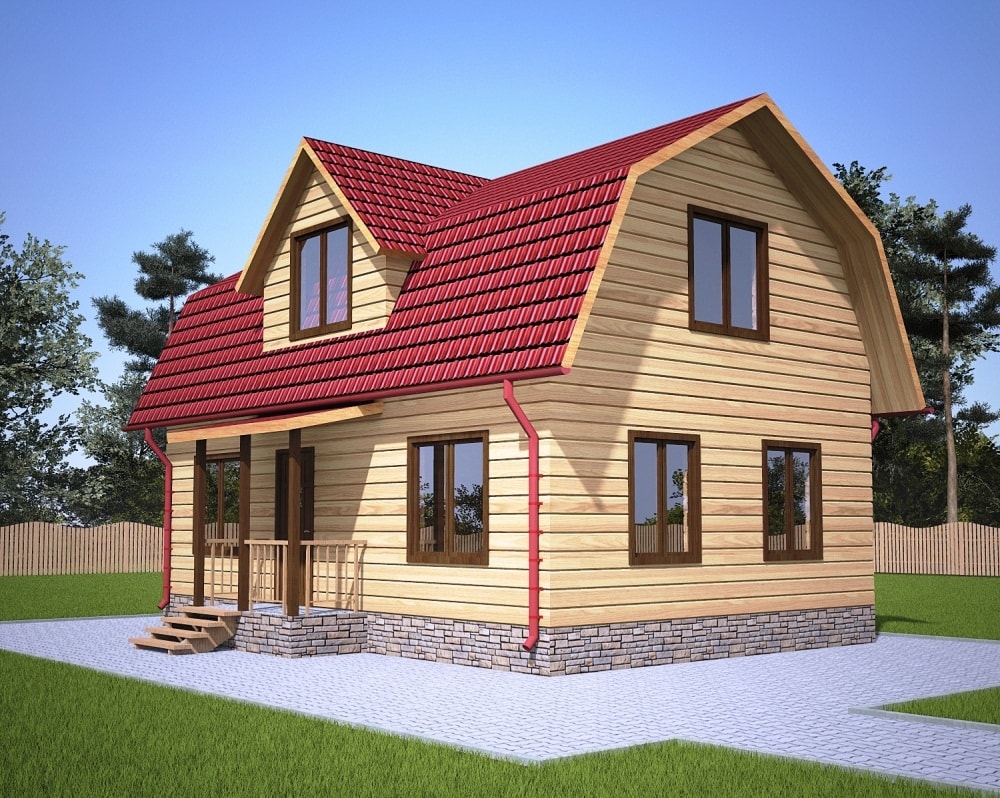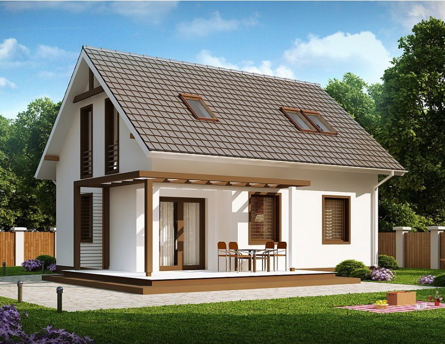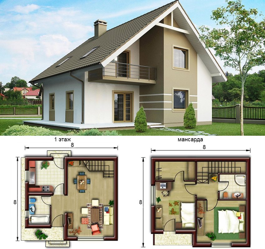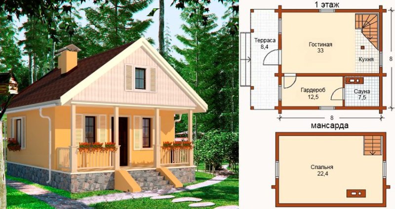 - 8x8 m. Lakonische und funktionale Option. Die erste Etage umfasst ein geräumiges Wohnzimmer, einen Kleiderschrank und eine Sauna. Attic Raum für das Schlafzimmer reserviert. Der Bonus ist die Terrasse.