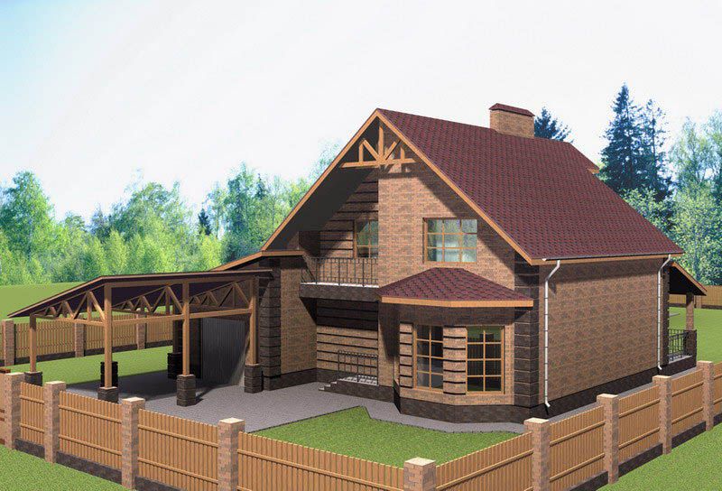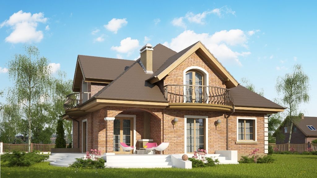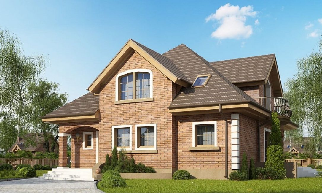 - Ein Haus mit dekorativem Ziegelfurnier sieht stilvoll aus. Die komplexe Konstruktion des Daches und die Anwesenheit eines Balkons machen den Dachboden gemütlich.