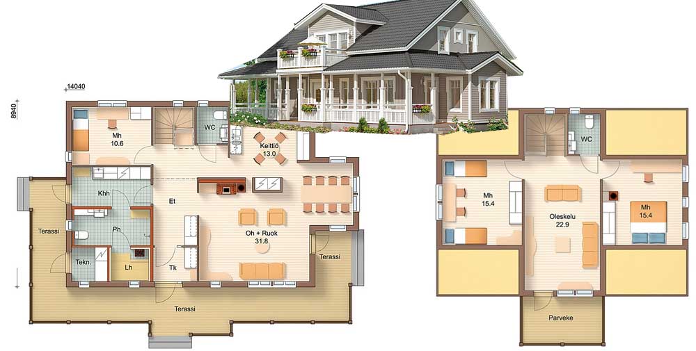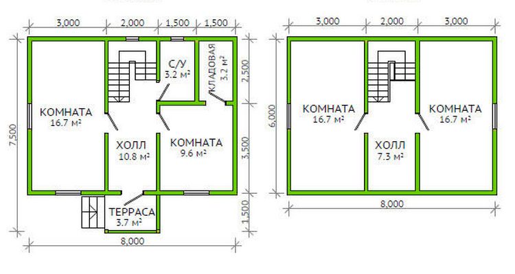 - 8x6 m. Multifunktionale Raumnutzung. Die untere Etage umfasst eine geräumige Küche und Gästezimmer, Bad, Sauna, Vorraum zur Terrasse. Dachboden befindet sich über dem Zimmer und Küche, besteht aus zwei Schlafzimmern.