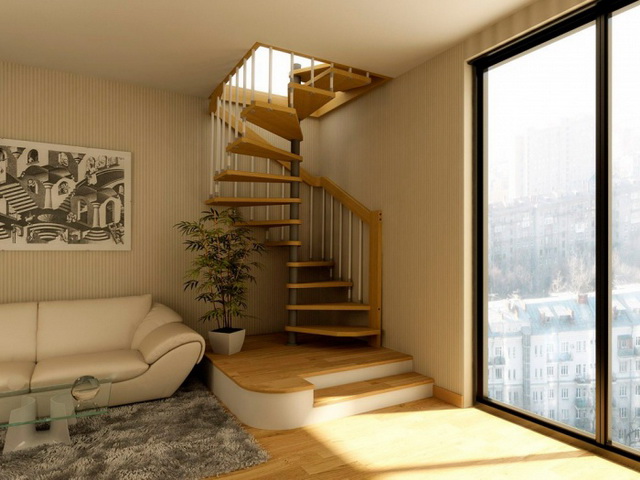 - Es besteht keine Notwendigkeit für eine massive Treppe. Ersetzen Sie es durch eine schmale oder Schraube. Standorte zwischen den Märschen sollten klein sein. Dies spart nutzbaren Speicherplatz.