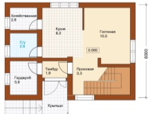 Eine ausgezeichnete Lösung für ein Haus mit Parametern von 6 bis 8 Metern wird ein Haus mit einer geräumigen Küche sein. Wenn man aus dem Haus kommt, kann man die Treppe sehen, und das Wohnzimmer kann zum Beispiel in der Nähe liegen. Ein Badezimmer kann in der Nähe des Eingangs ausgestattet werden. Wenn Sie sich entscheiden, eine Wohnung mit einem Dachboden zu bauen, wird es möglich sein, drei Schlafzimmer in das Layout aufzunehmen, und dies ist eine gute Option für eine große Familie.
