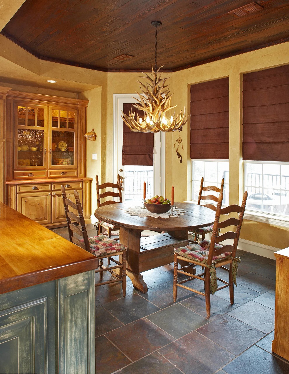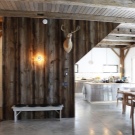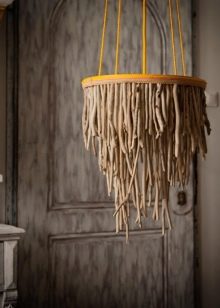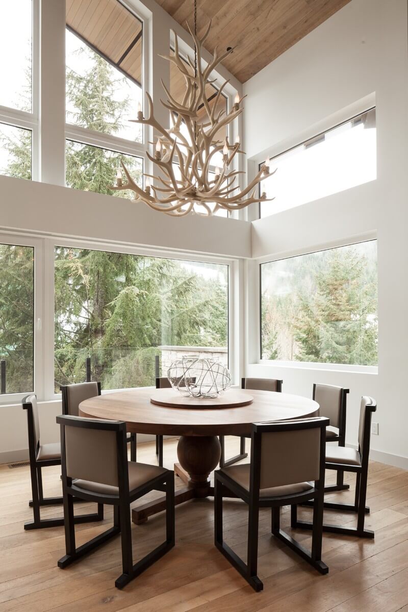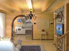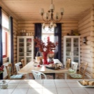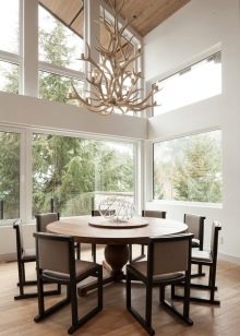Achten Sie in einem solchen Öko-Haus auf helle Beleuchtung. Dies kann nicht nur mit Hilfe von Lampen erreicht werden, sondern mit einer großen Anzahl von Fenstern, die viel Sonnenlicht in den Raum einlassen.Der Raum zwischen den Fenstern oder Glaswänden kann in kräftigen Farben gestrichen werden - dann werden Sie ein Gefühl der Transparenz der Luft erhalten und die Fläche optisch vergrößern. Ein Kronleuchter in Form eines Geweihbüschels ergänzt das Öko-Design Ihres Wohnzimmers oder Ihrer großen Küche.