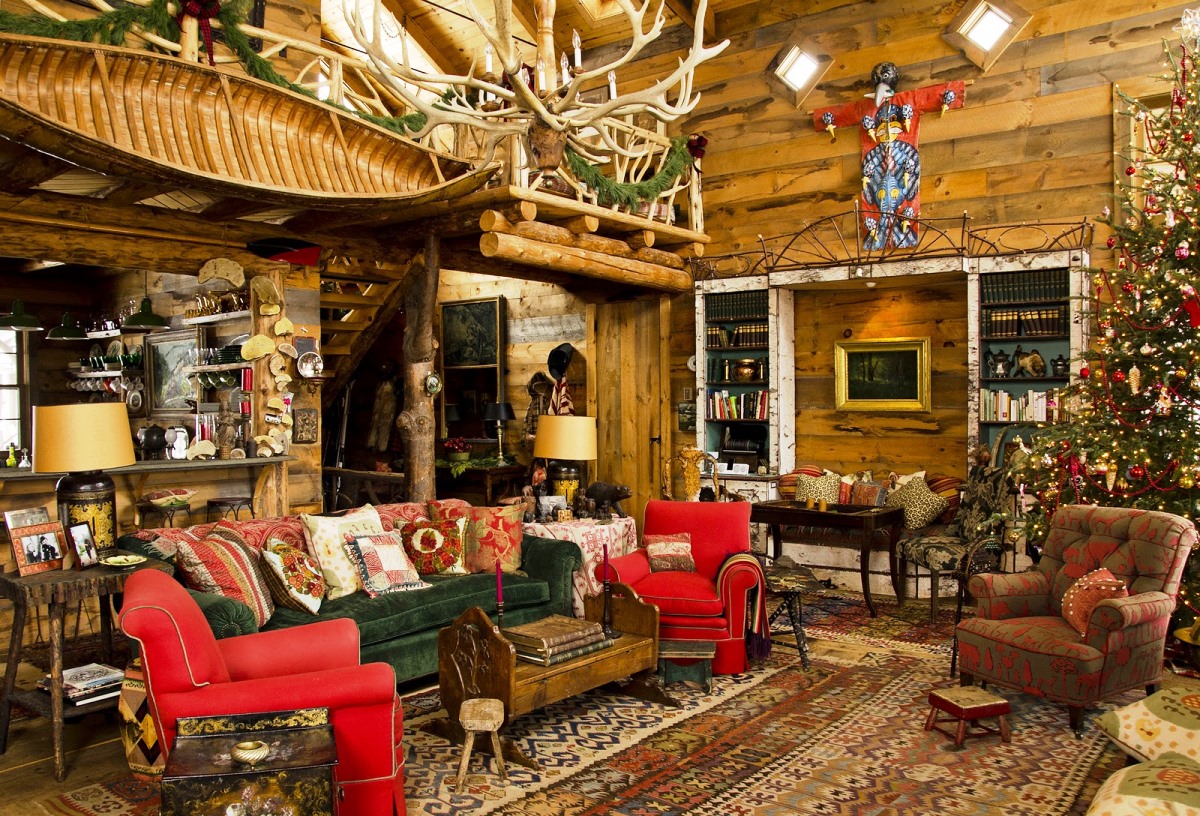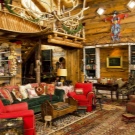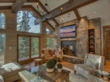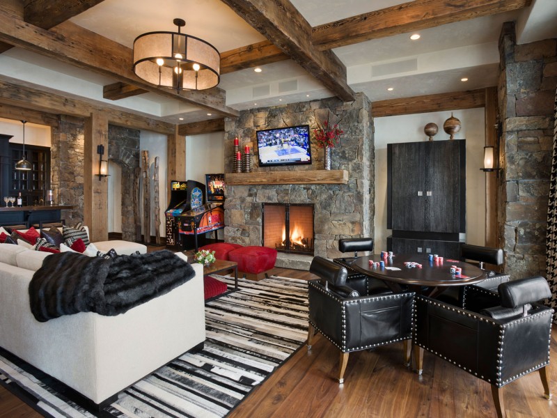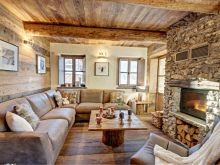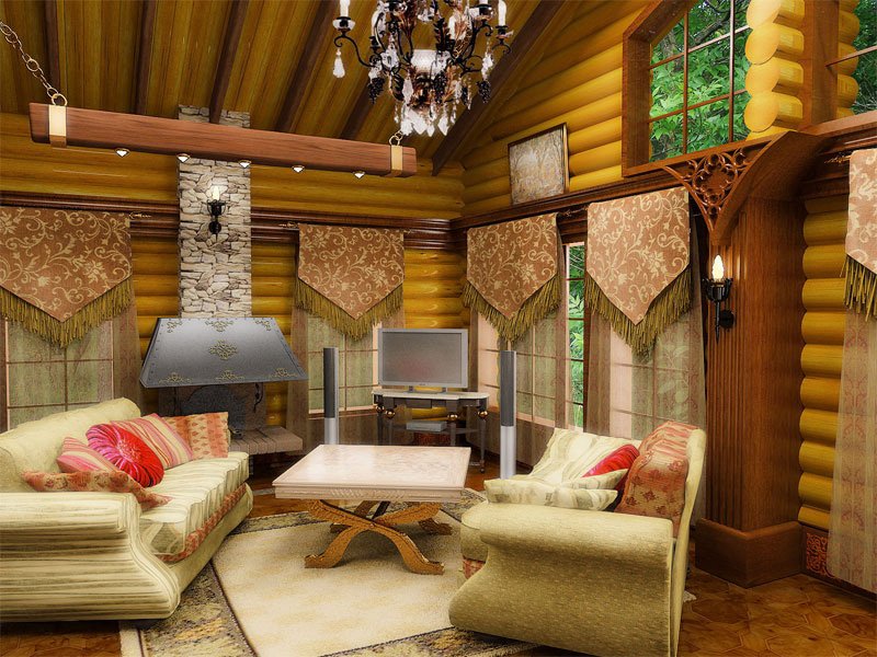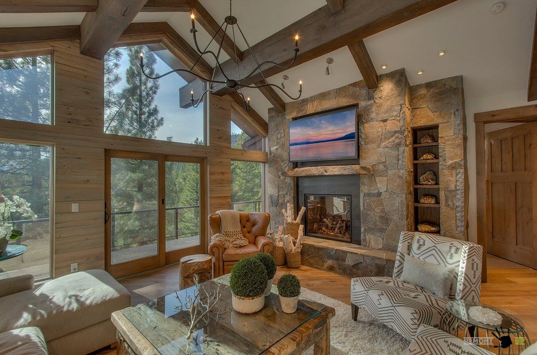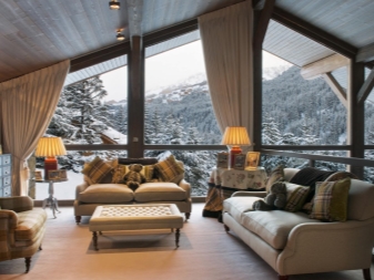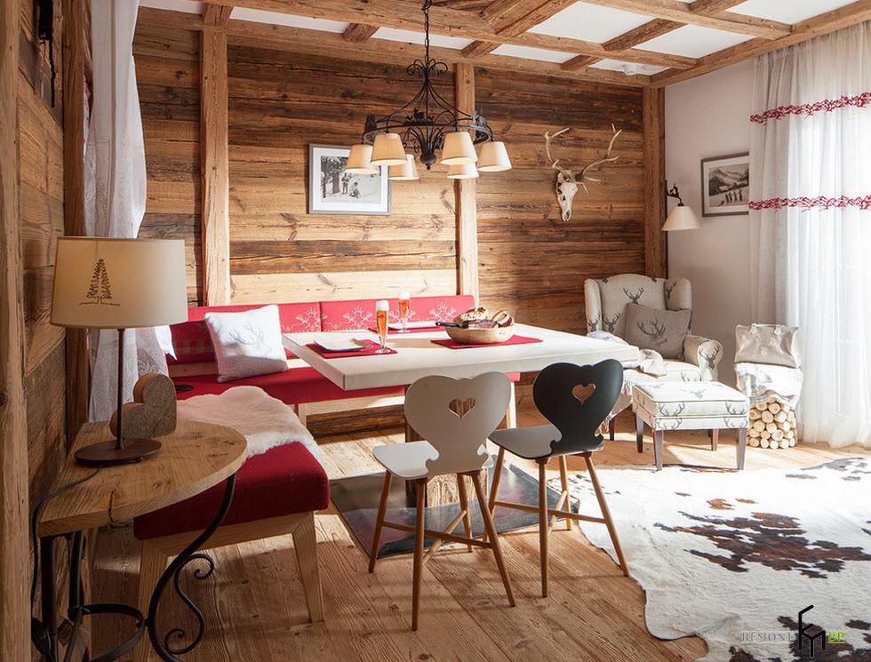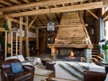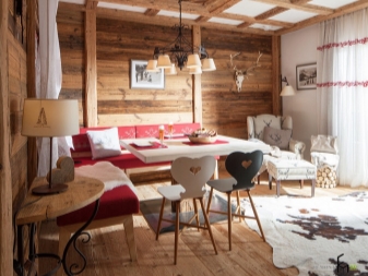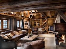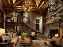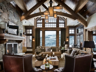 Chalet - minimale edle Dekoration, Holzdecke und Wände, keine ultramodernen Haushaltsgeräte. Hölzerne Wände können mit ausgestopften Tierköpfen oder Waffen aufgehängt werden. "Altmodische" Lampen in Form von Kerzen können als Zubehör verwendet werden, Tierhäute können auf ein Sofa und Stühle geworfen werden, und Polster können aus Leder, Pelz oder Wolle hergestellt werden. Übrigens, in diesem Stil inakzeptabel helle Beleuchtung, sollten Töne gedämpft werden. Der Kamin ist im Wohnzimmer obligatorisch - es ist mit seiner gemütlichen Beleuchtung das Design im WohnbereichDie Räumlichkeiten werden einzigartig und stilvoll sein.