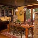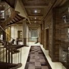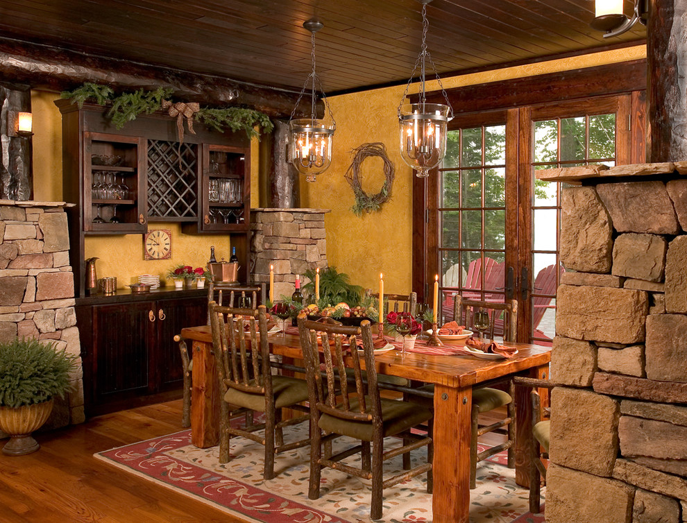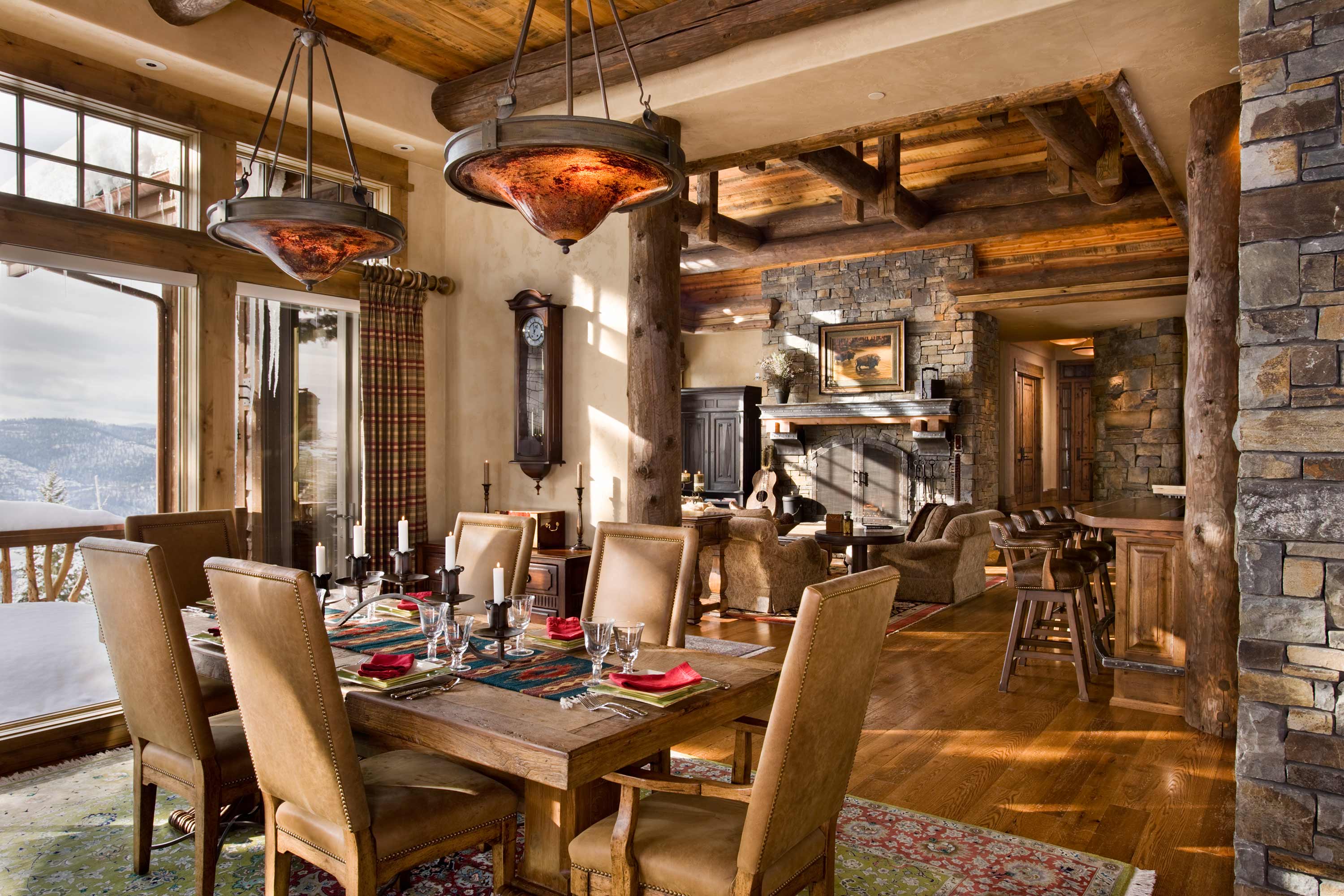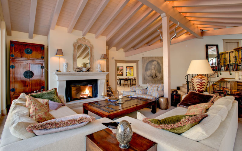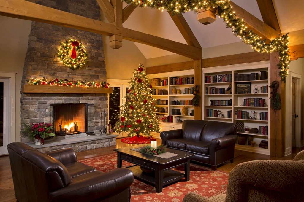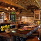 Chalet - minimale edle Dekoration, Holzdecke und Wände, keine ultramodernen Haushaltsgeräte. Hölzerne Wände können mit ausgestopften Tierköpfen oder Waffen aufgehängt werden. "Altmodische" Lampen in Form von Kerzen können als Zubehör verwendet werden, Tierhäute können auf ein Sofa und Stühle geworfen werden, und Polster können aus Leder, Pelz oder Wolle hergestellt werden. Übrigens, in diesem Stil inakzeptabel helle Beleuchtung, sollten Töne gedämpft werden. Der Kamin ist im Wohnzimmer obligatorisch - es ist mit seiner gemütlichen Beleuchtung das Design im WohnbereichDie Räumlichkeiten werden einzigartig und stilvoll sein.