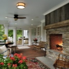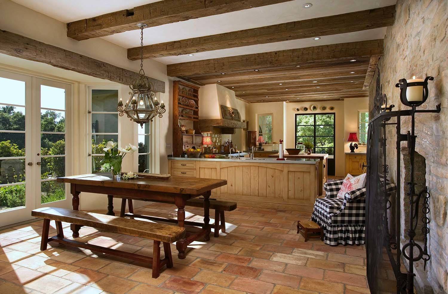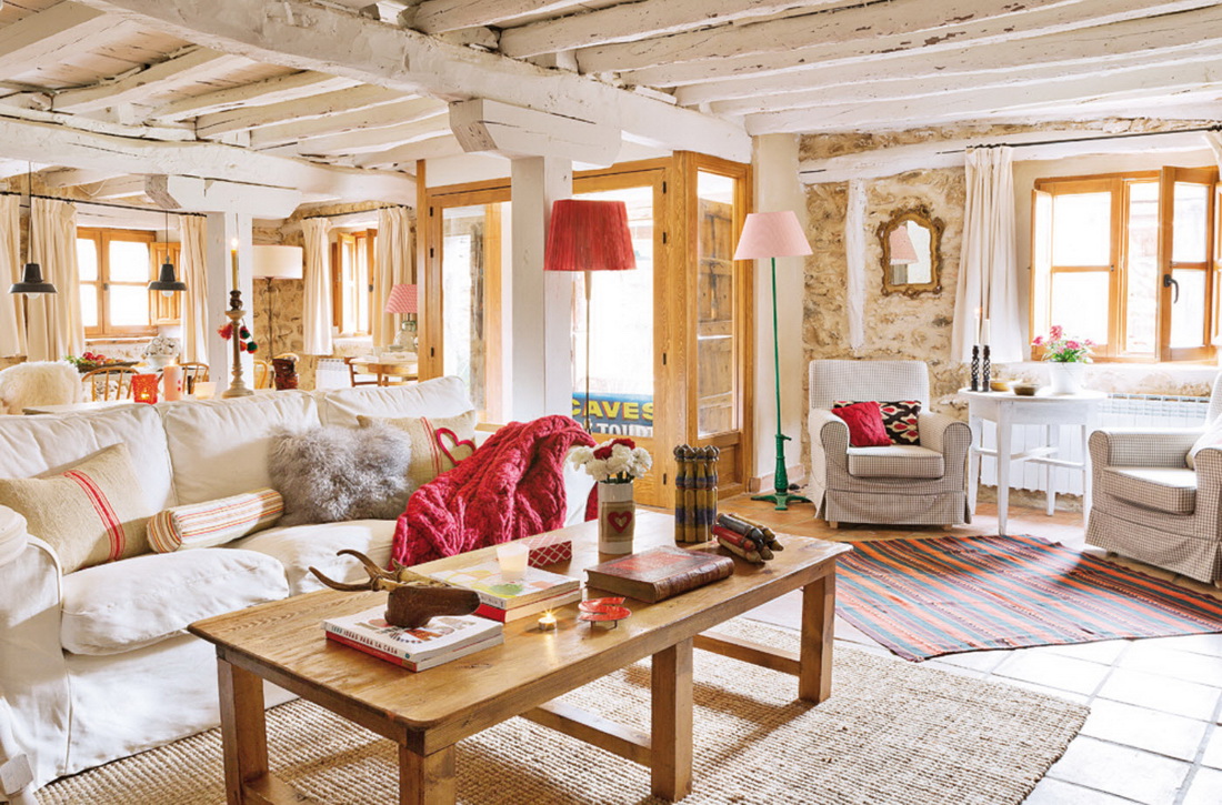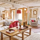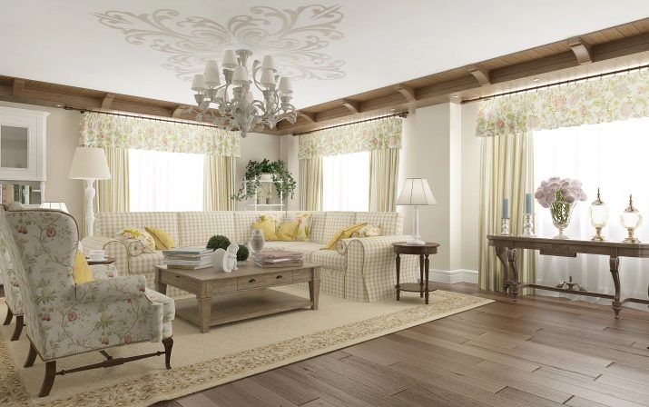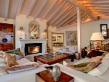 Nicht schlecht wird aussehen und Wände mit dekorativen Putz oder dekorativen Stein. Der Boden in einem solchen Landhaus muss ebenfalls aus Holz sein, aber die Decke kann einfach weiß verputzt oder mit Holzbalken verziert werden. Im Wohnzimmer, im Landhausstil eingerichtet, wird der Kamin perfekt passen.
