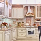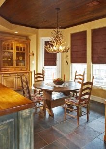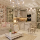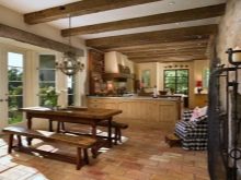 Die Küche in diesem Stil "benötigt" einen massiven Holztisch, in den Regalen können Sie Fayence-Teller, "gealtertes" Buffet, Leinenhandtücher mit Stickerei arrangieren.