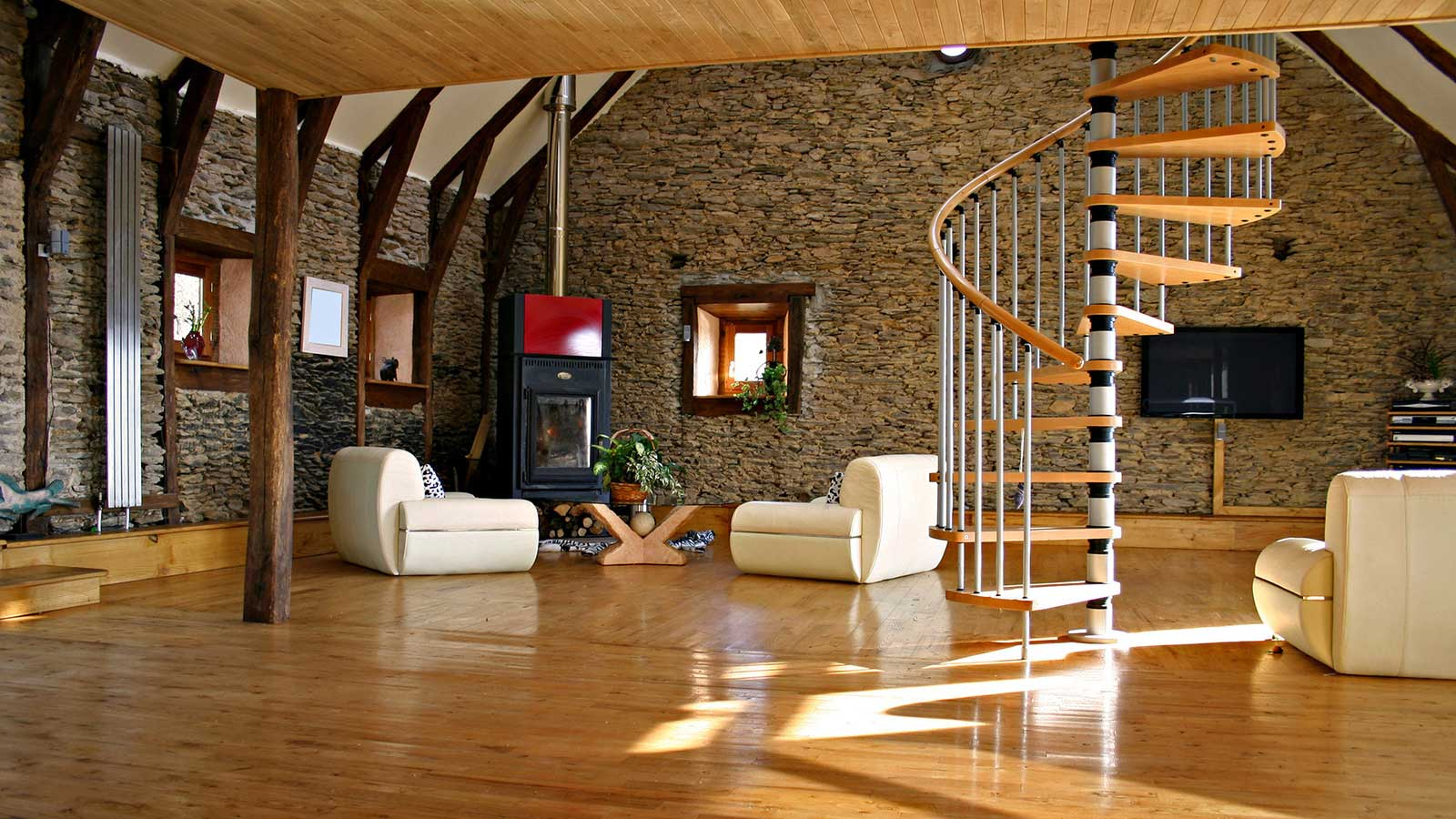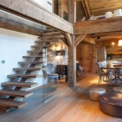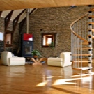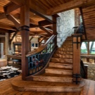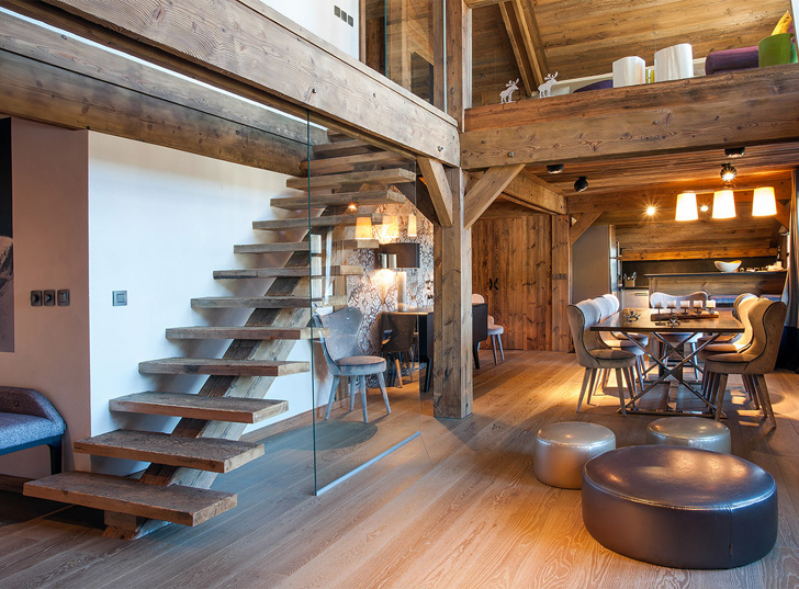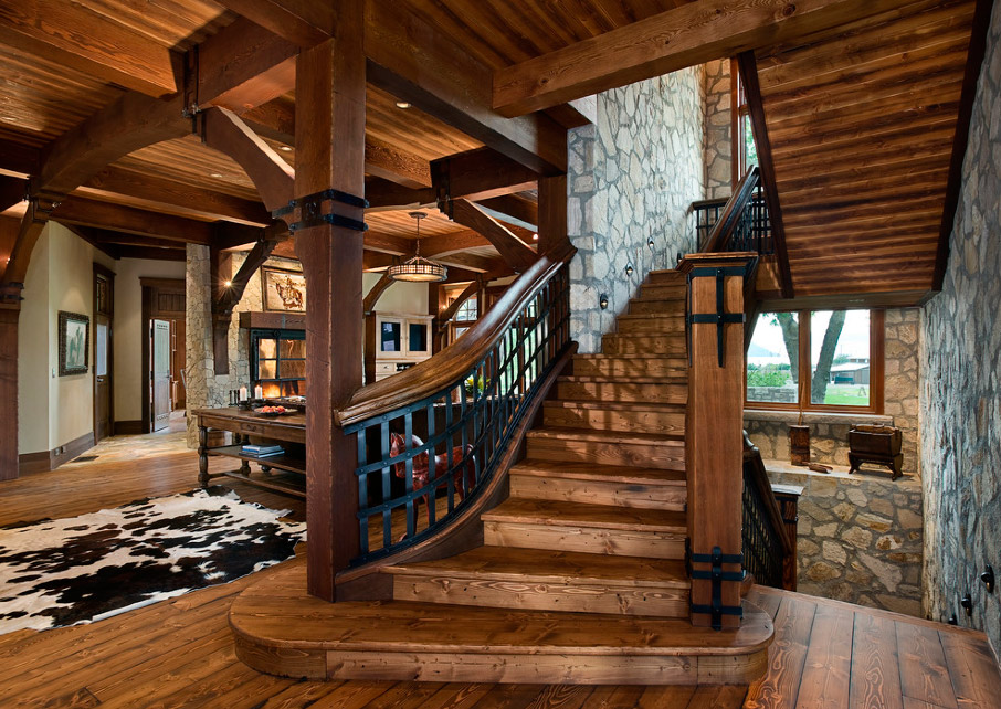 Heute bieten Designer mehr als eine Version von Leiter-Designs.: Schraube, Dreh- und Mittelflug. Alle Designs sind aus Material gefertigt, das zu Ihrem gewählten Raum passt: aus Marmor, Glas, Granit und Holz. Wenn Sie beispielsweise ein Hightech-Fan sind und Ihr Landhaus nicht wie die anderen ist, können Sie Glas, Kunststoff und Metall verwenden. Landhausstil Treppen und Chalets müssen aus Holz sein, obwohl manchmal Experten empfehlen, es aus ungeschnittenem Stein zu machen.